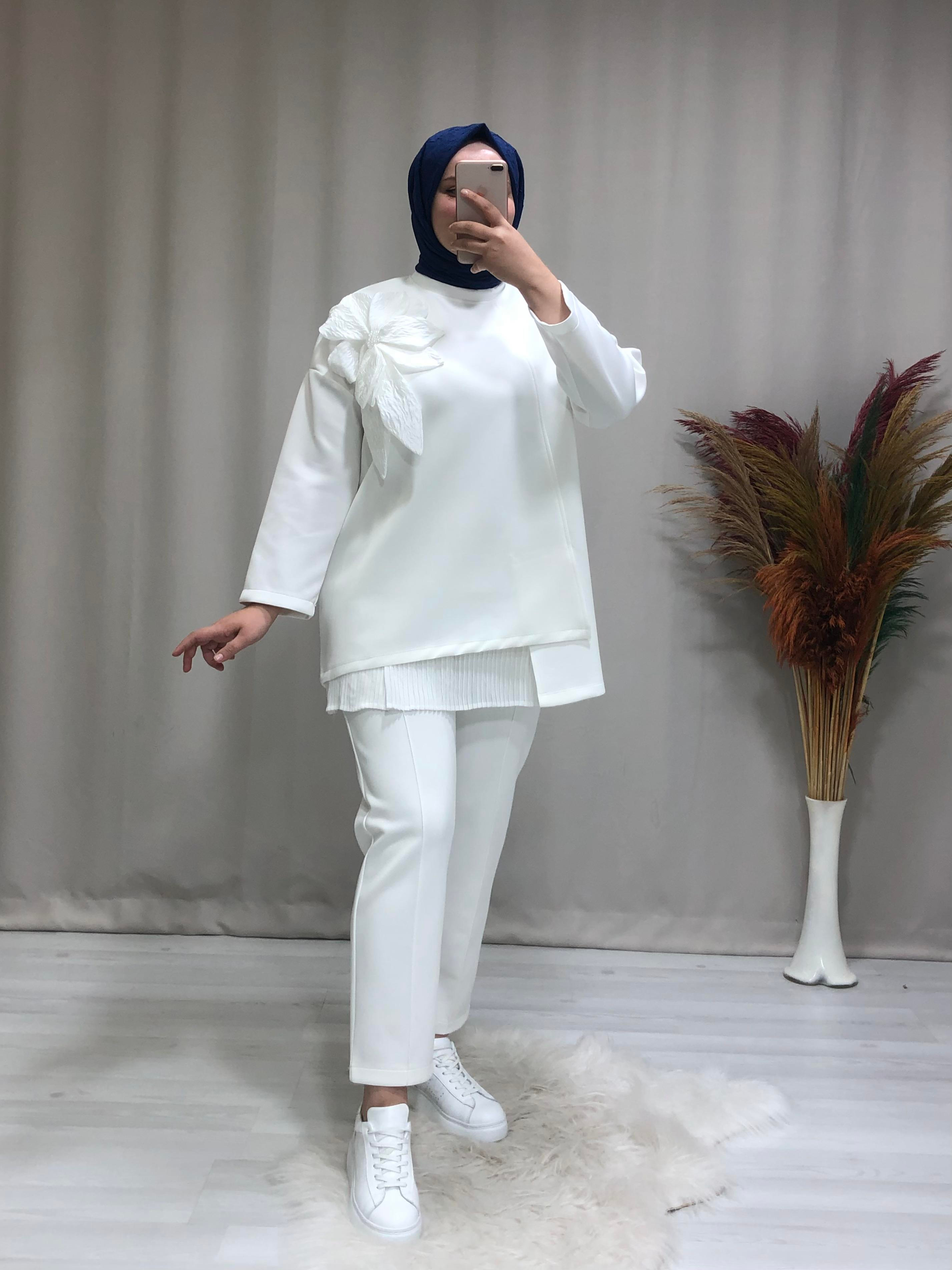 • Kadın scuba çiçek desenli tesettür şık takım. Ürünümüz bisiklet yaka, düşük omuzlu, önden yırtmaç detayı bulunur. Pantolon beli lastikli, çima dikişlidir.