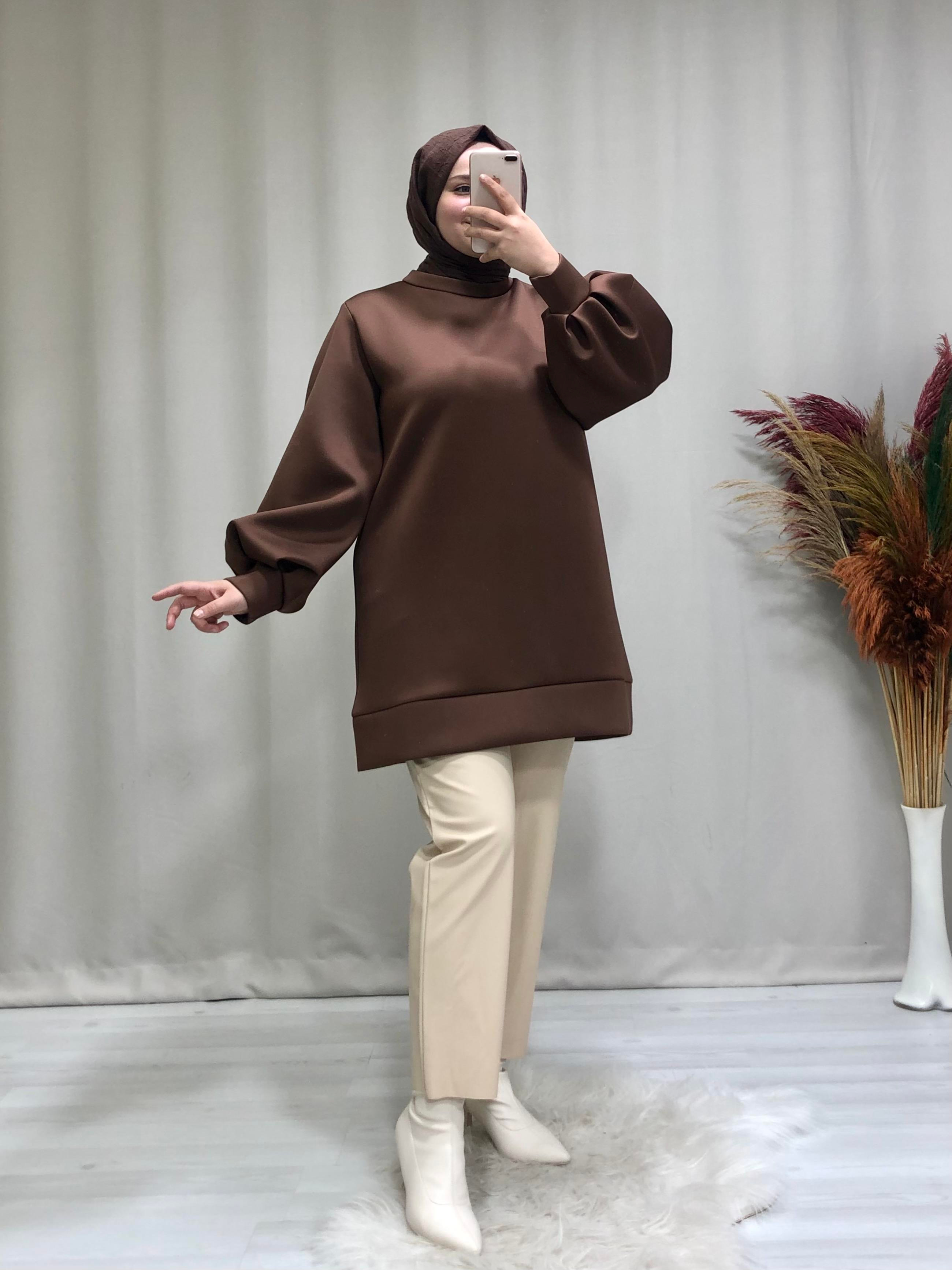 • Kadın scuba kumaş balon kol tesettür tunik. Ürünümüz bisiklet yaka, scuba kumaş, balon kol şeklindedir.
