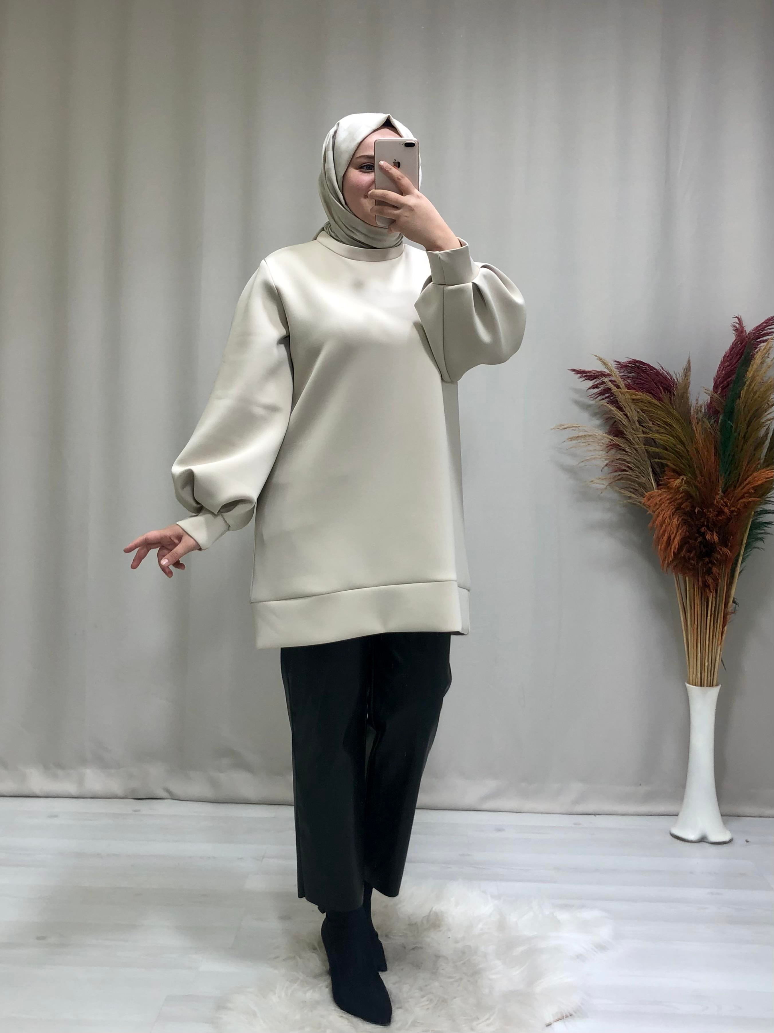 • Kadın scuba kumaş balon kol tesettür tunik. Ürünümüz bisiklet yaka, scuba kumaş, balon kol şeklindedir.
