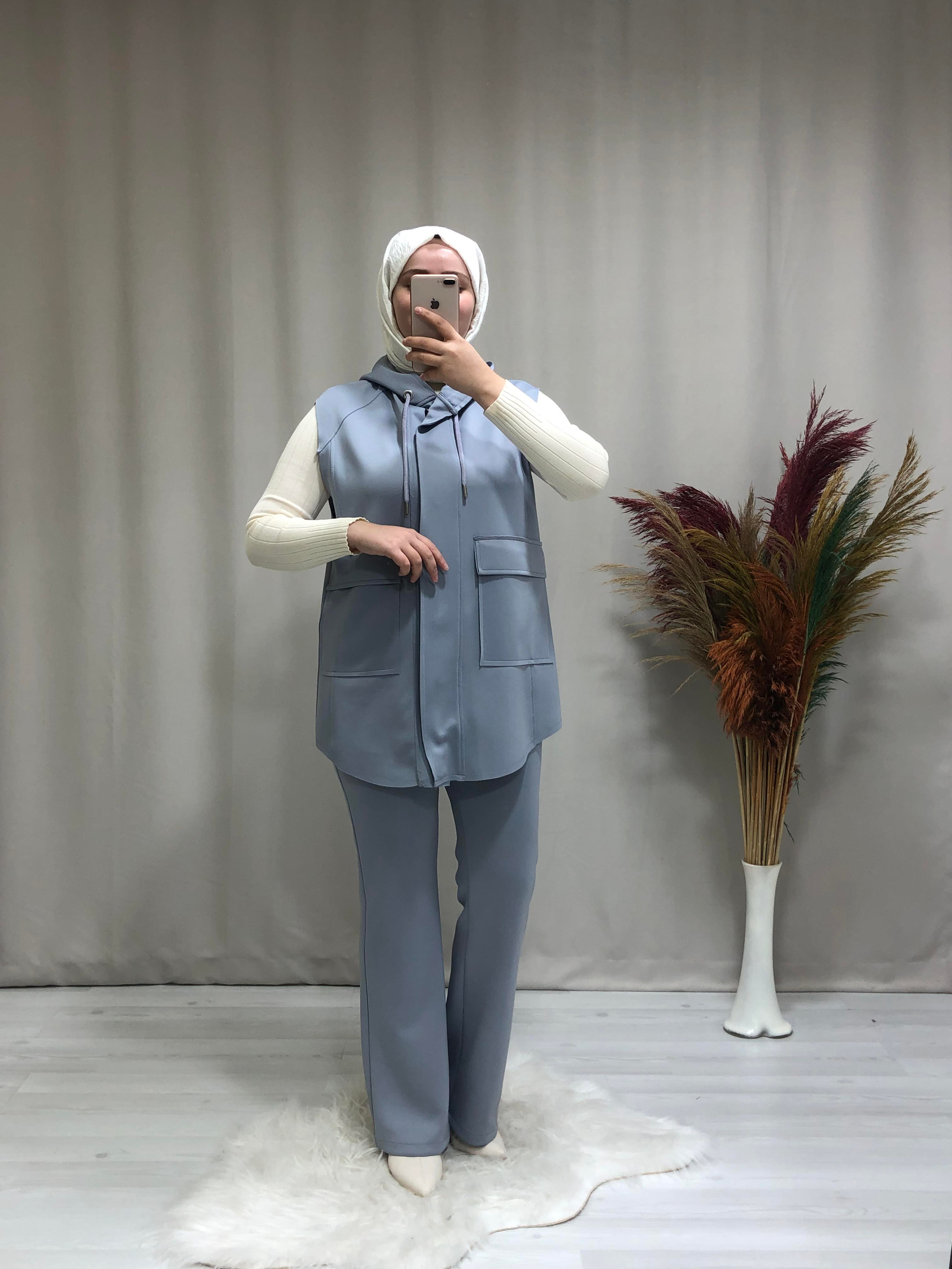 Kadın Scuba Kumaş Kapüşonlu Yelekli Tesettür Takım. Önden cepli gizli çıt çıt kapamadır.