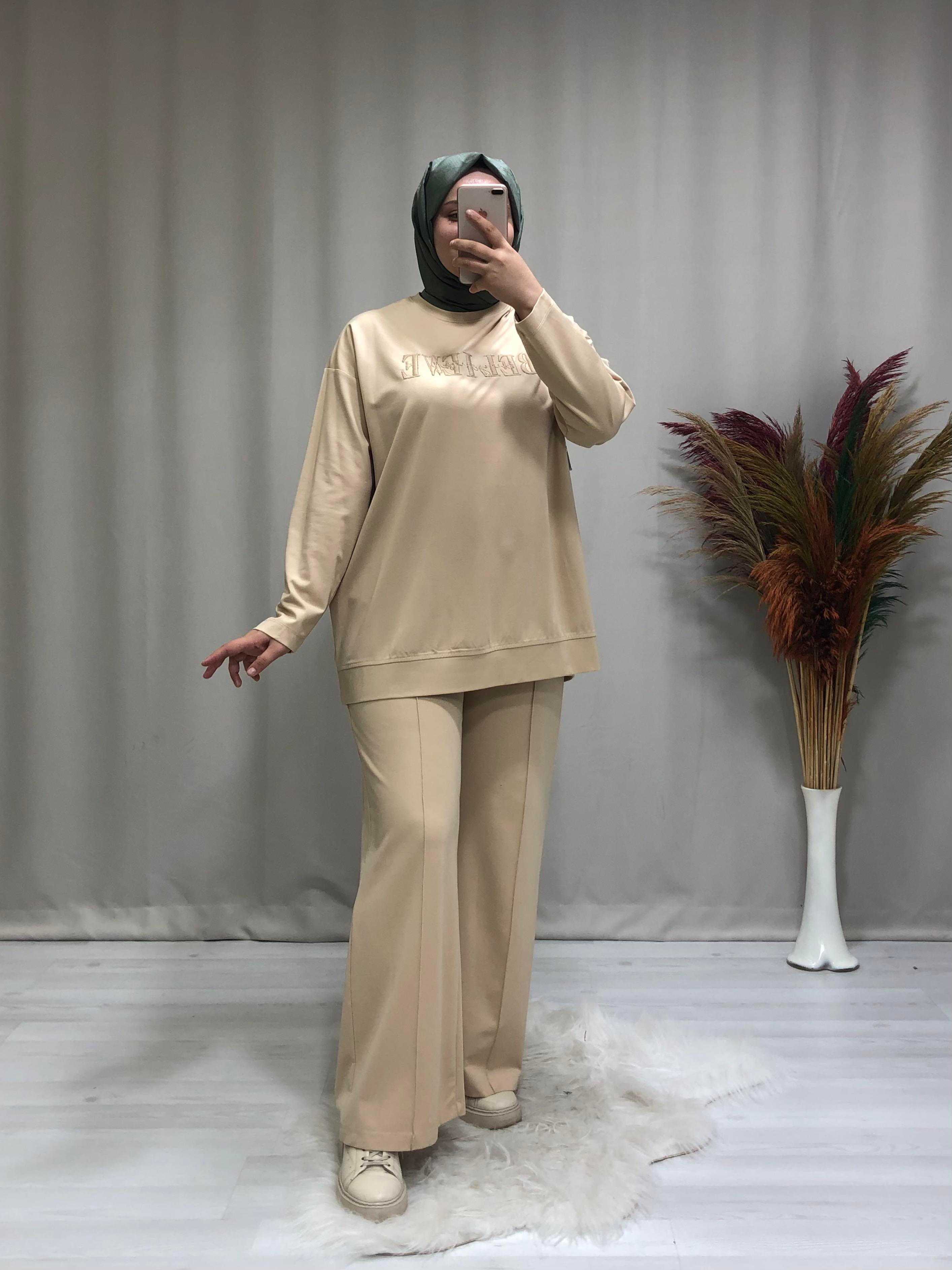 • Kadın sim detay nakışlı tesettür takım. Ürünümüz bisiklet yaka, salaş rahat kalıp, önde sim nakış detaylıdır .Pantolon beli lastikli,