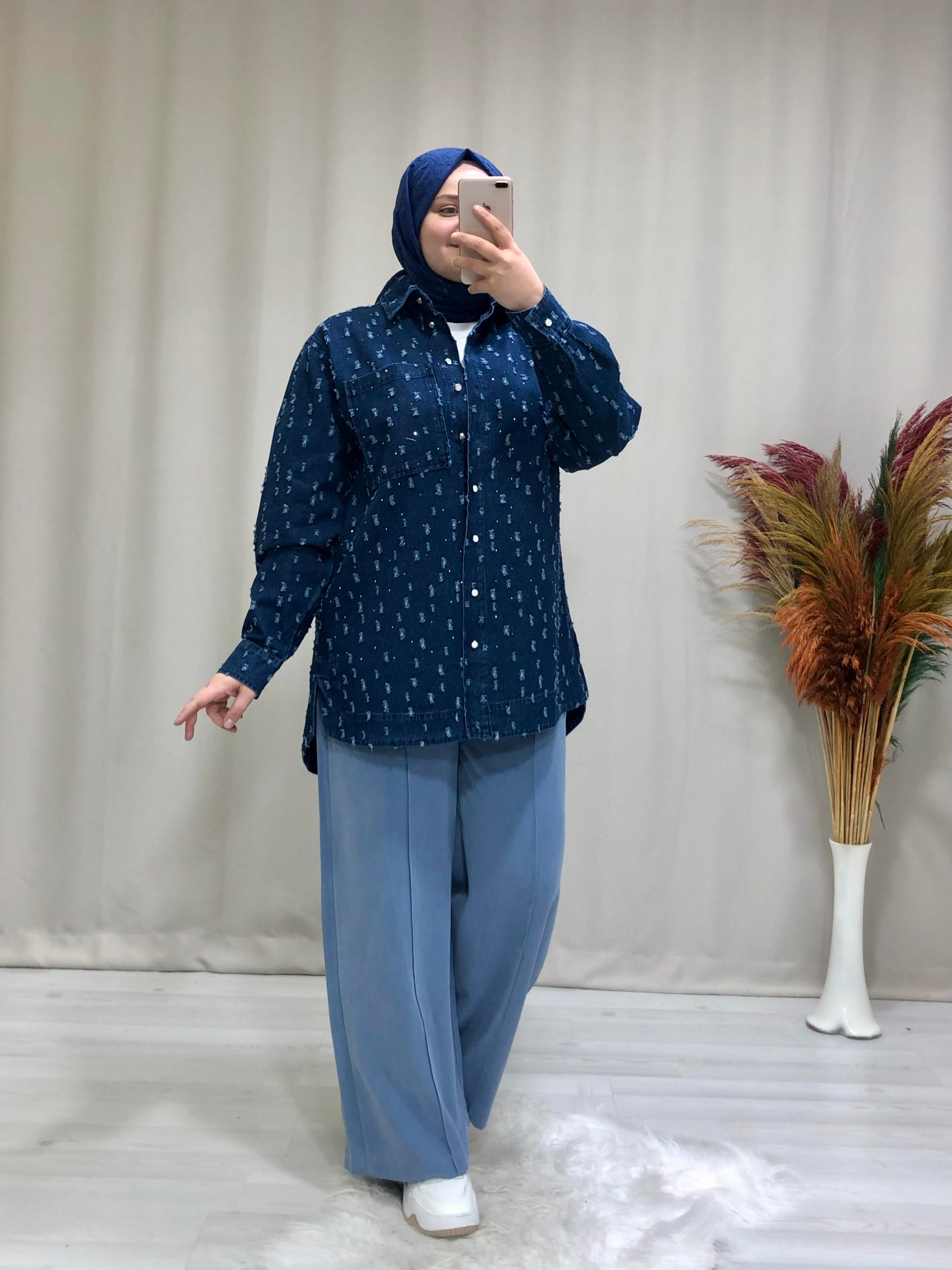 • Kadın taş detaylı tesettür kot gömlek. Ürünümüz önden düğmeli, gömlek yaka, cep detaylı, kendinden taş baskılıdır.