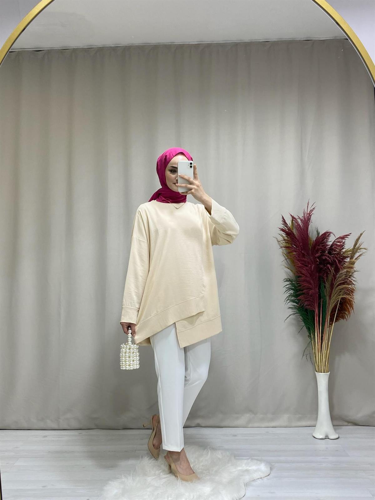 KADIN TAŞ RENGİ AEROBİN KUMAŞ ASİMETRİK KESİM TESETTÜR TUNİK