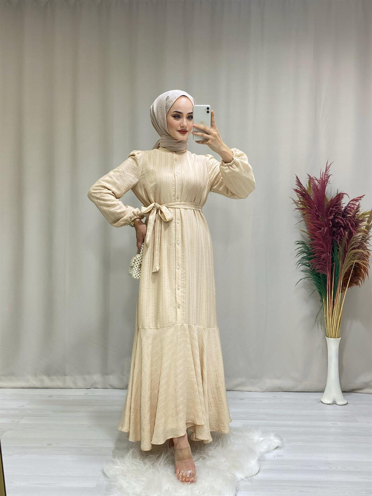 KADIN TAŞ RENGİ KETEN KUMAŞ TESETTÜR YAZLIK ELBİSE