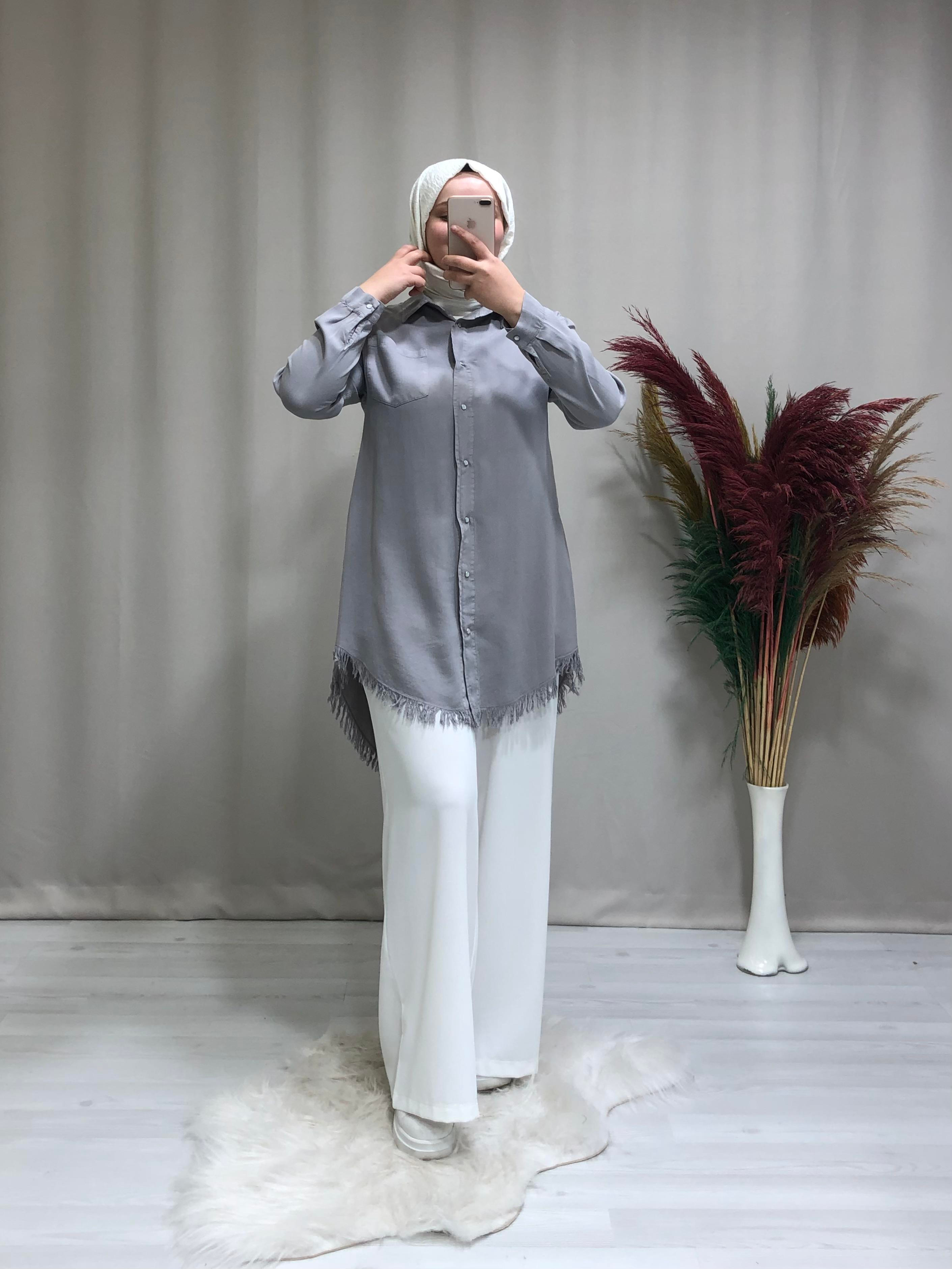 Kadın tencel kumaş tesettür tunik. Ürünümüz gömlek yaka ,önden çıtçıtlı,etek uçları püskül detaylıdır.