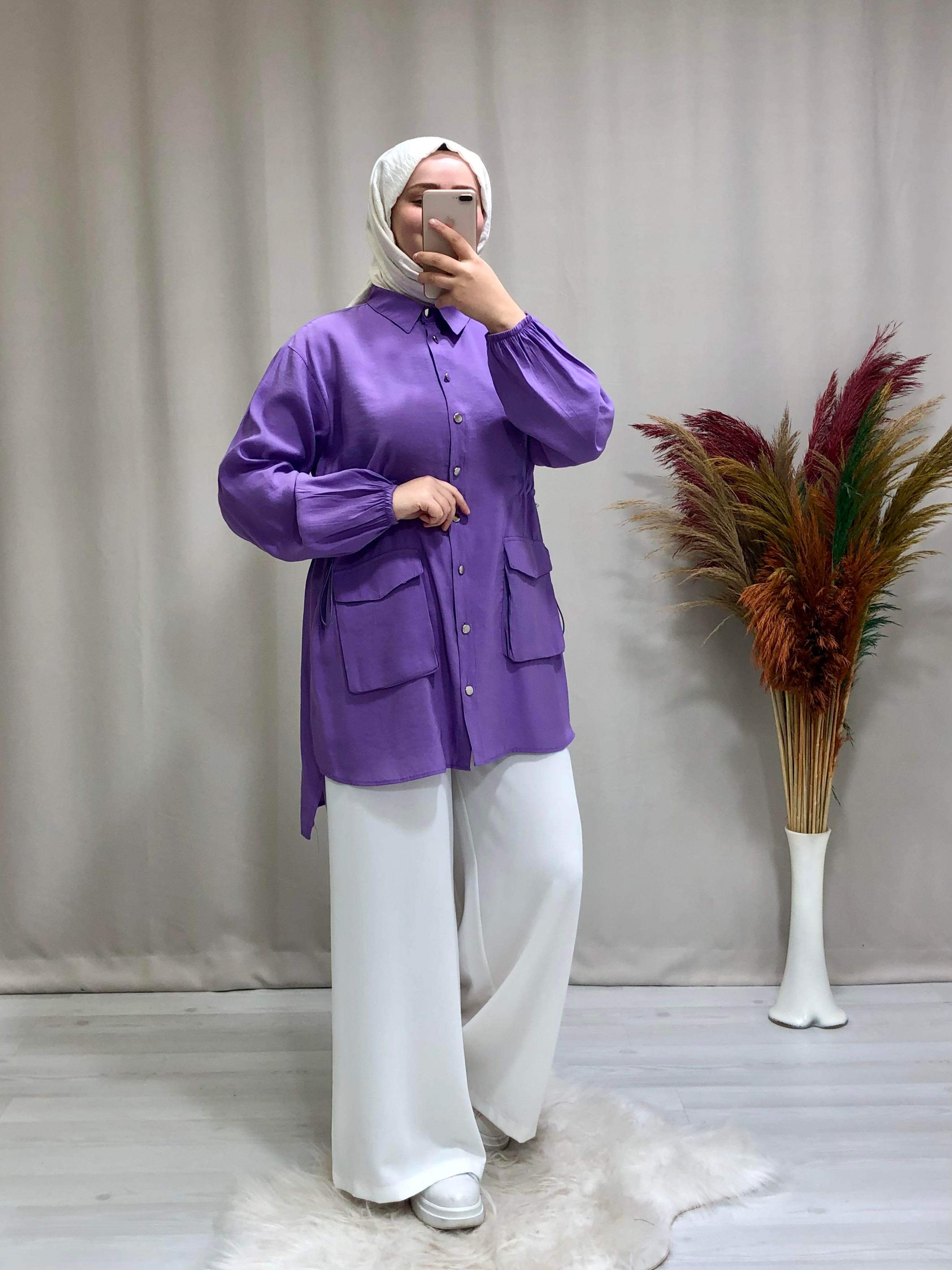 Kadın tesettür belden büzgülü tunik. Ürünümüz gömlek yaka, önden düğmeli, belinden ayarlana bilir büzgü detaylı,