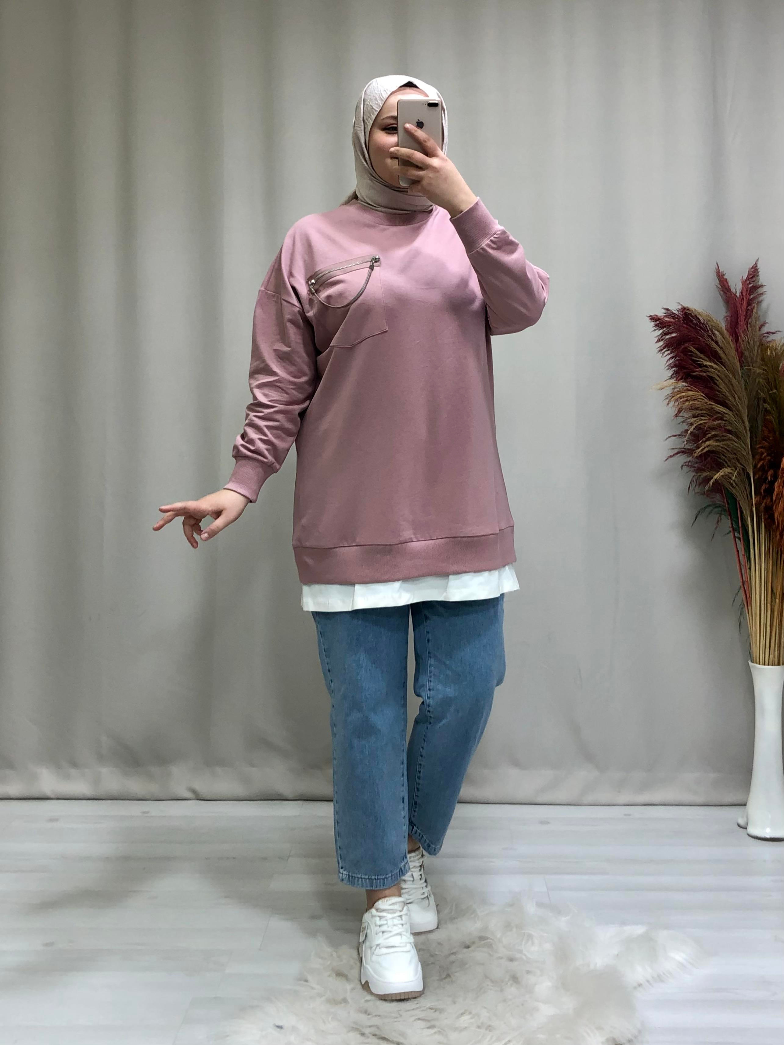 • Kadın tesettür cep zincir detaylı sweat. Ürünümüz bisiklet yaka, cep detayı zincir geçişli, etek ucu parça kumaş detaylıdır.