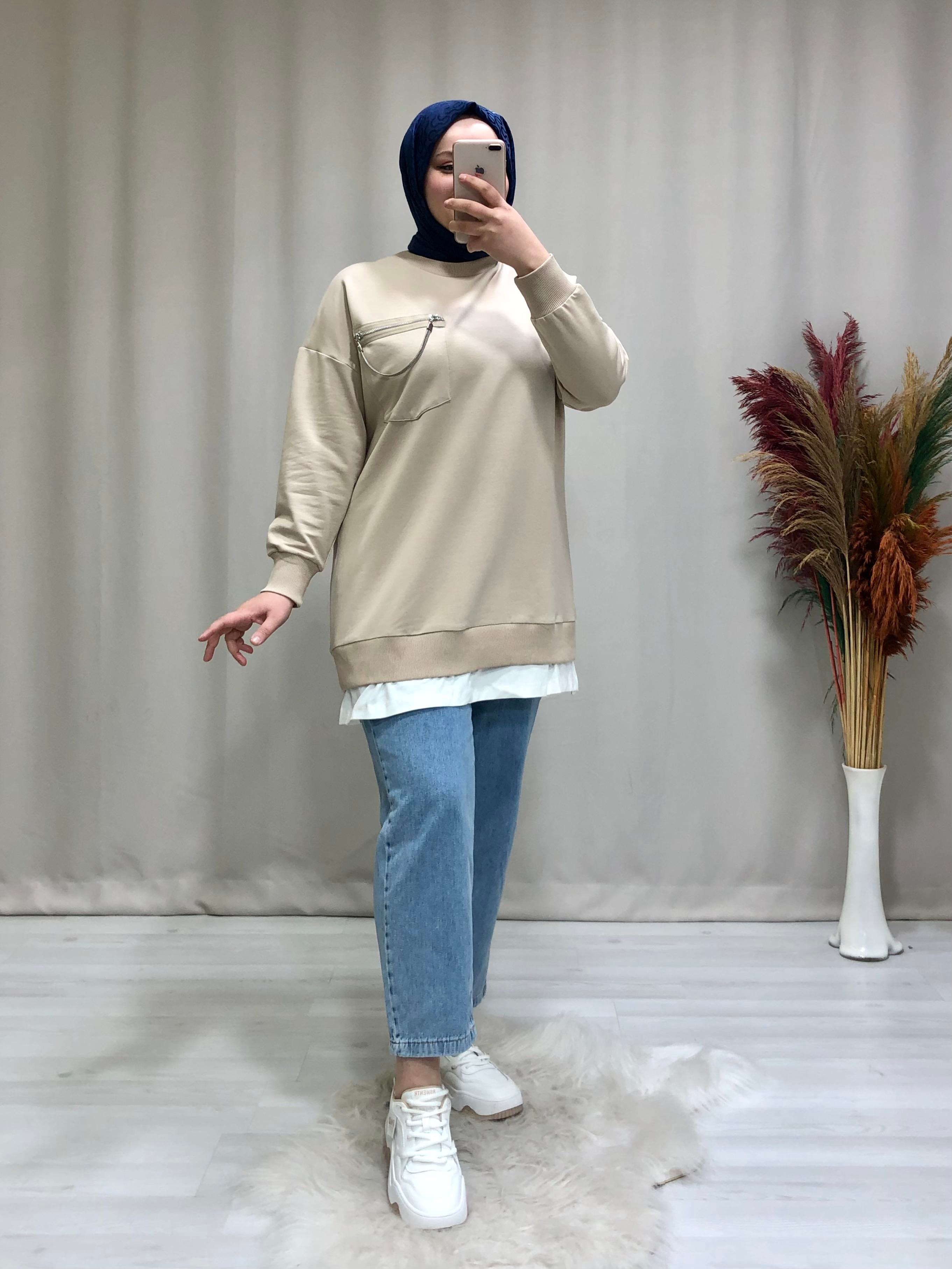 • Kadın tesettür cep zincir detaylı sweat. Ürünümüz bisiklet yaka, cep detayı zincir geçişli, etek ucu parça kumaş detaylıdır.