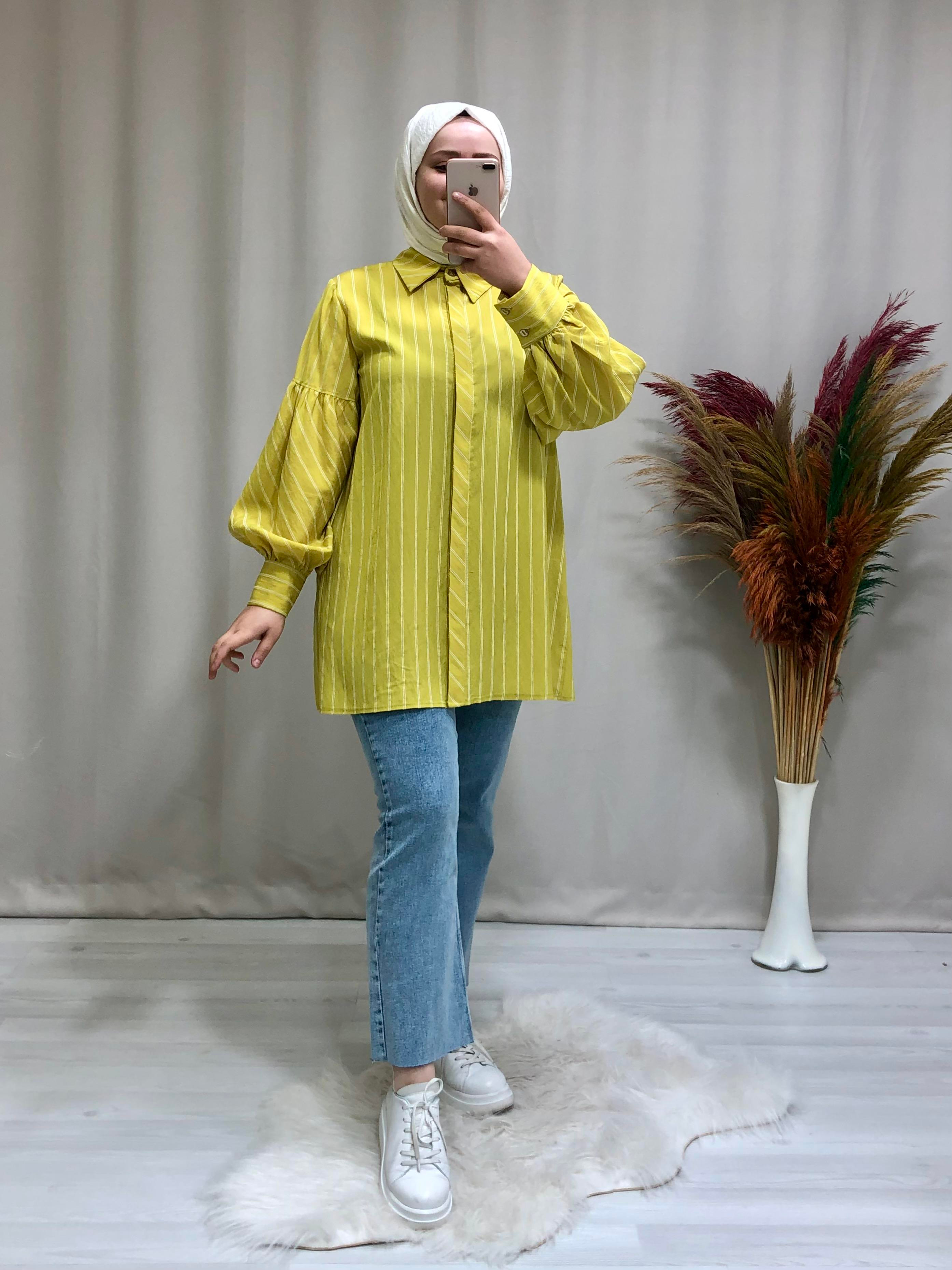 Kadın tesettür çizgili tunik. Ürünümüz gömlek yaka,önden düğmeli,bolon kol,