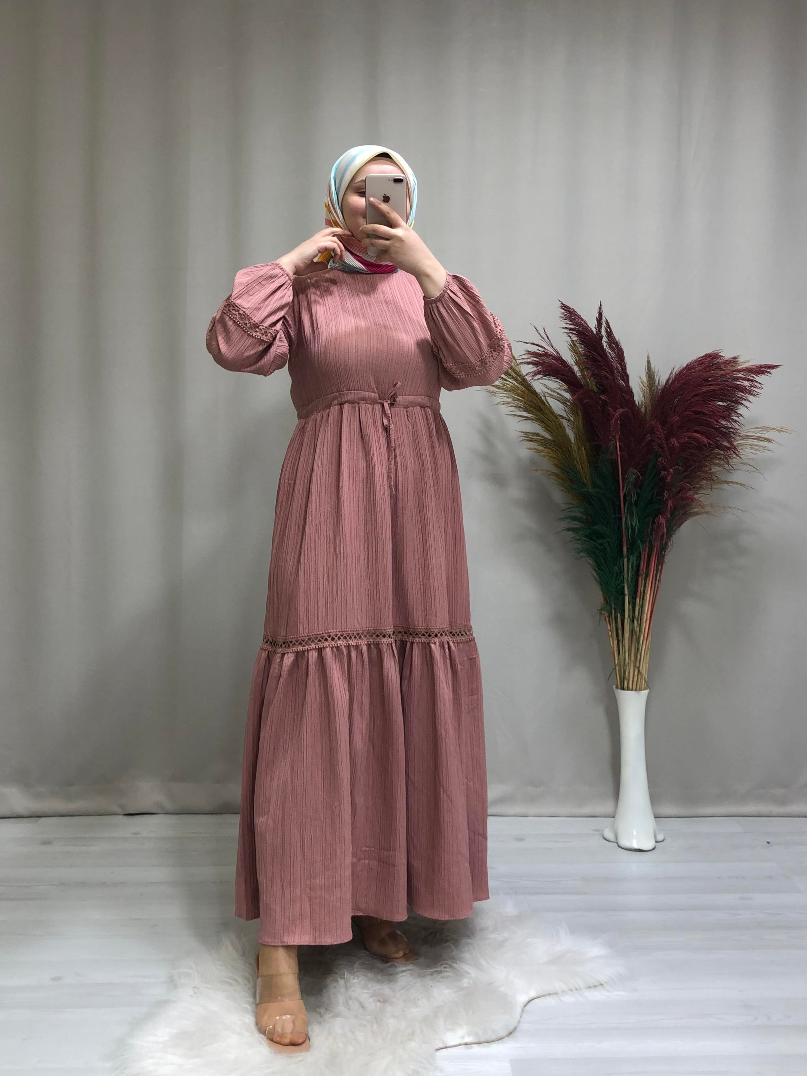 Kadın tesettür fisto kumaş yazlık elbise. Ürünümüz bisiklet yaka, belden büzgülü, kol ve etek uçları fisto detaylı, kolları lastikli,