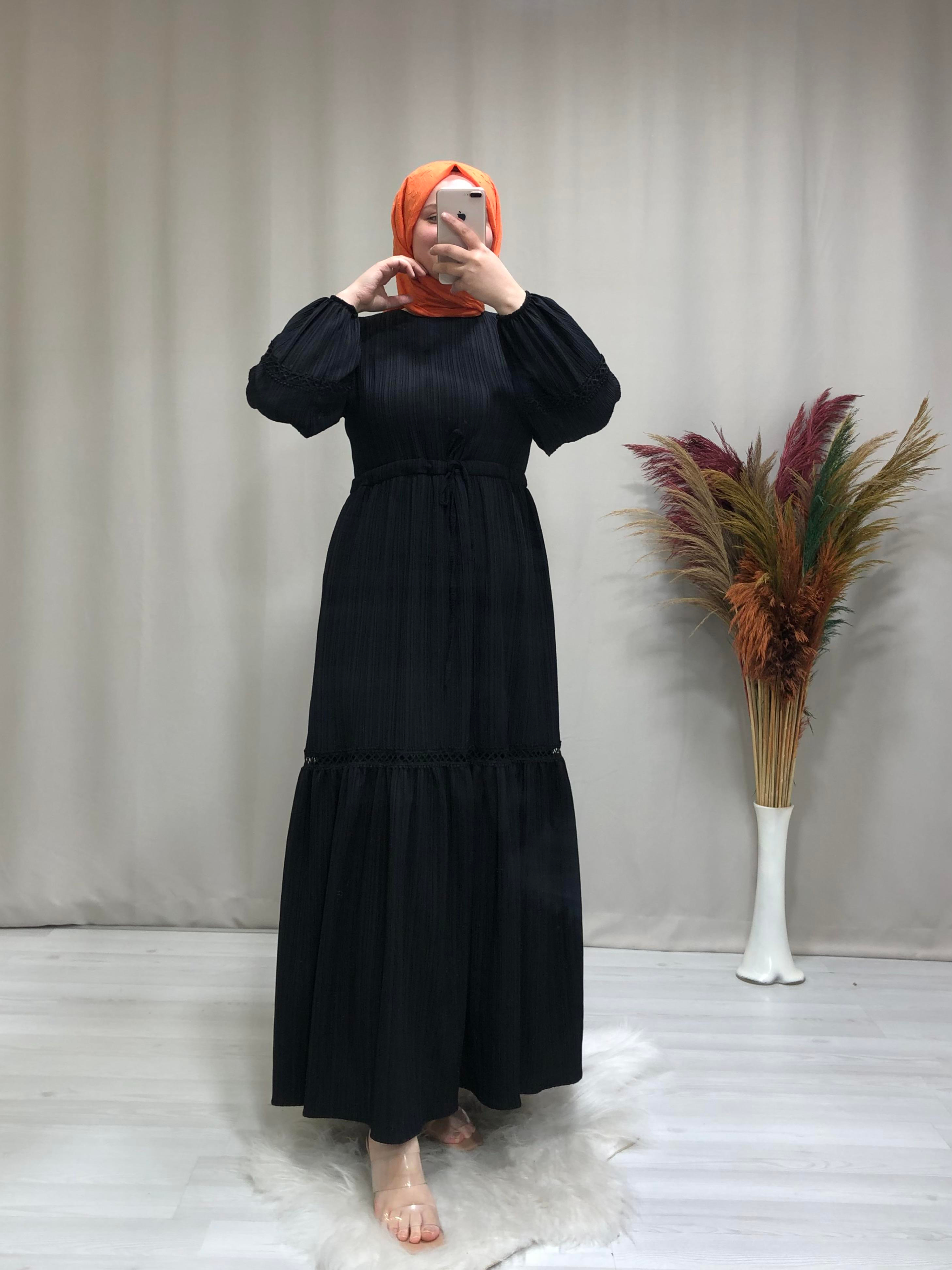 Kadın tesettür fisto detaylı yazlık elbise. Ürünümüz bisiklet yaka, belden büzgülü, kol ve etek uçları fisto detaylı, kolları lastikli,