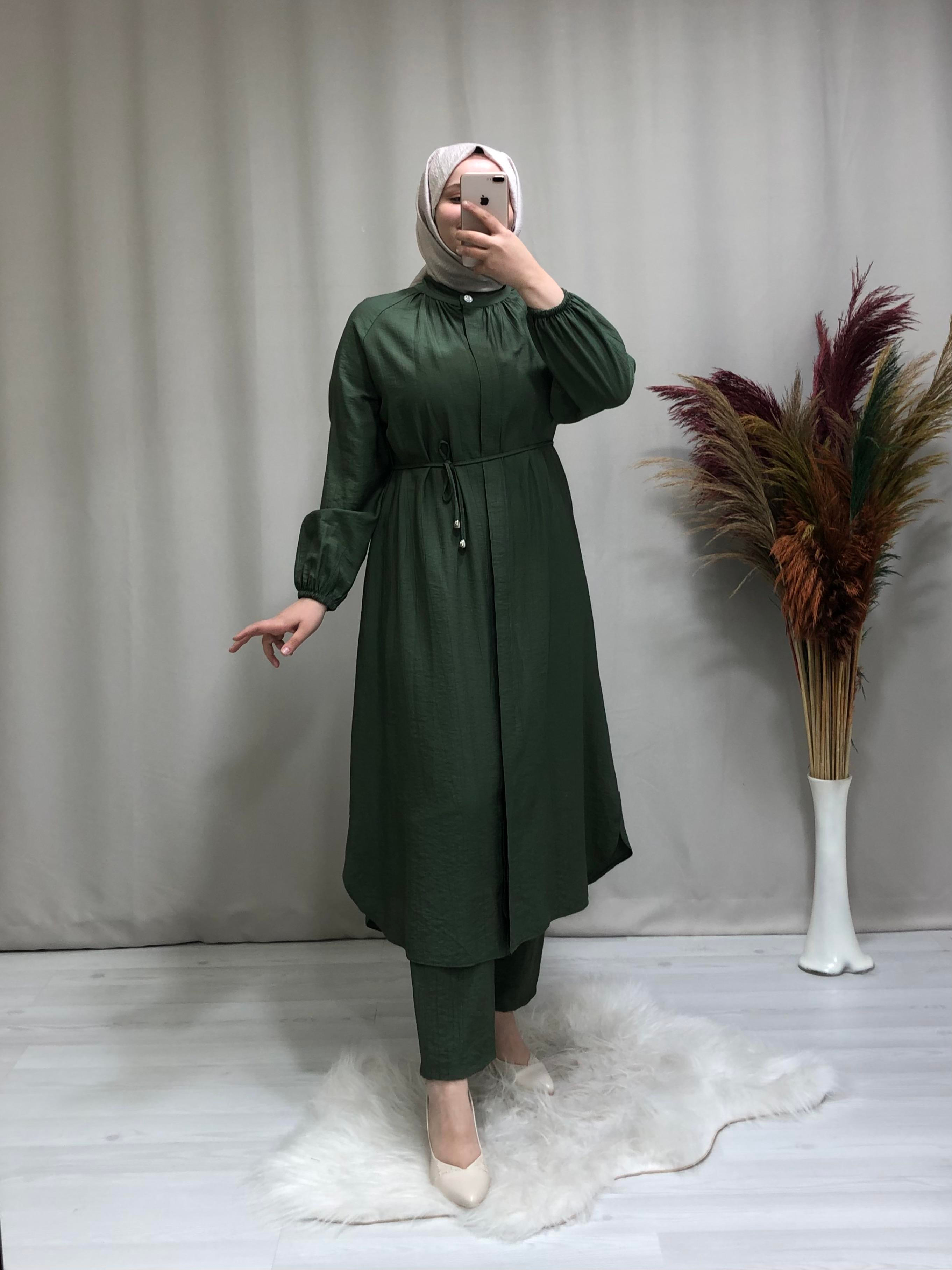 Kadın tesettür gizli düğme detaylı keten takım. Ürünümüzün kolları lastikli, belden ip bağlama detayı olup salaş kesimdir. pantolon beli lastikli havuç modeldir. 38 benden ölçüleri:(bedenler arası 2 cm oynamaktadır) uzunluk:125cm göğüs:52cm basen:60cm pantolon uzunluk:98cm basen:56cm