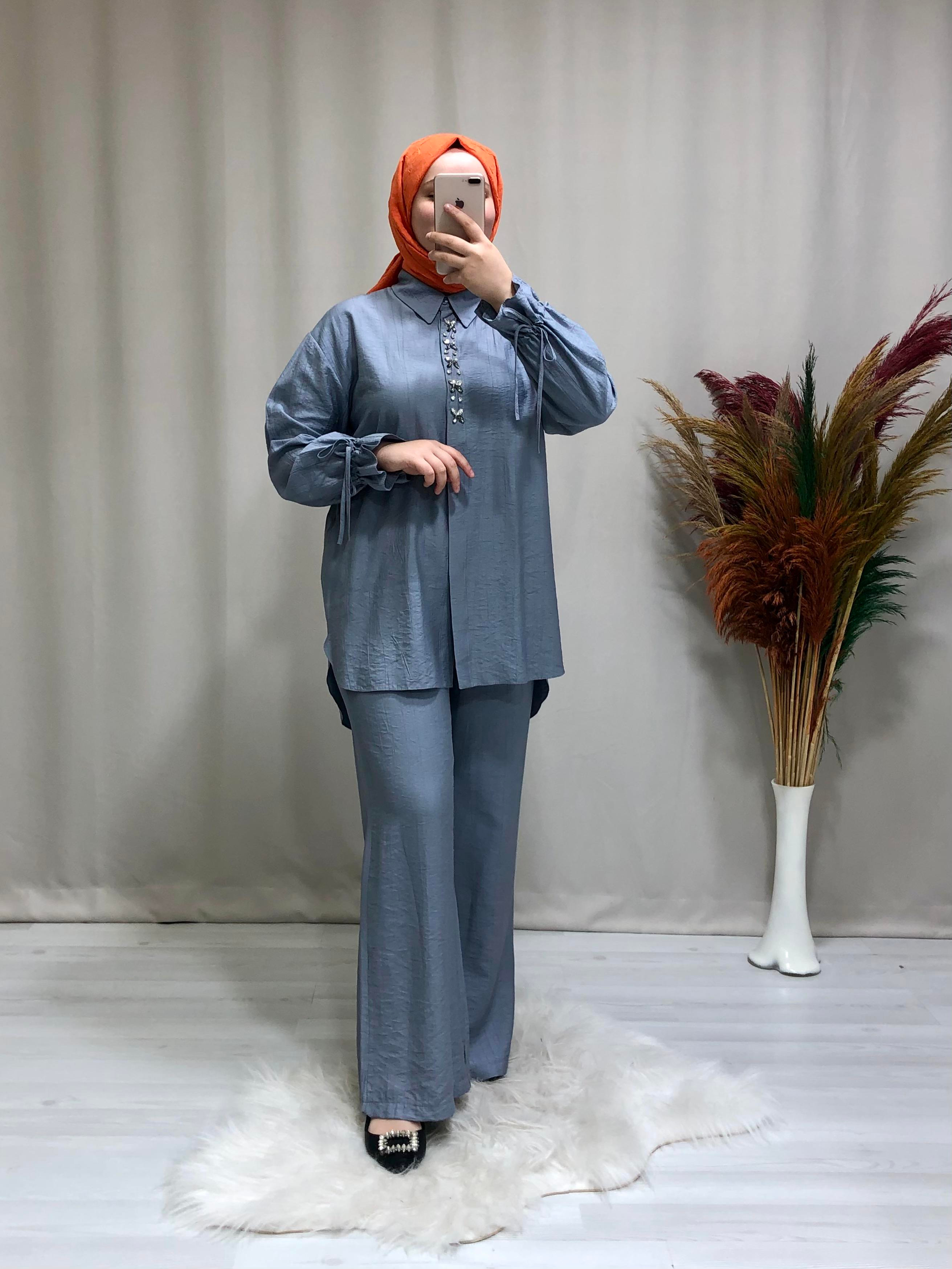Kadın tesettür ikili takım. Ürünümüz gömlek yaka, önden düğmeli, kolları lastikli bağcık detaylı,