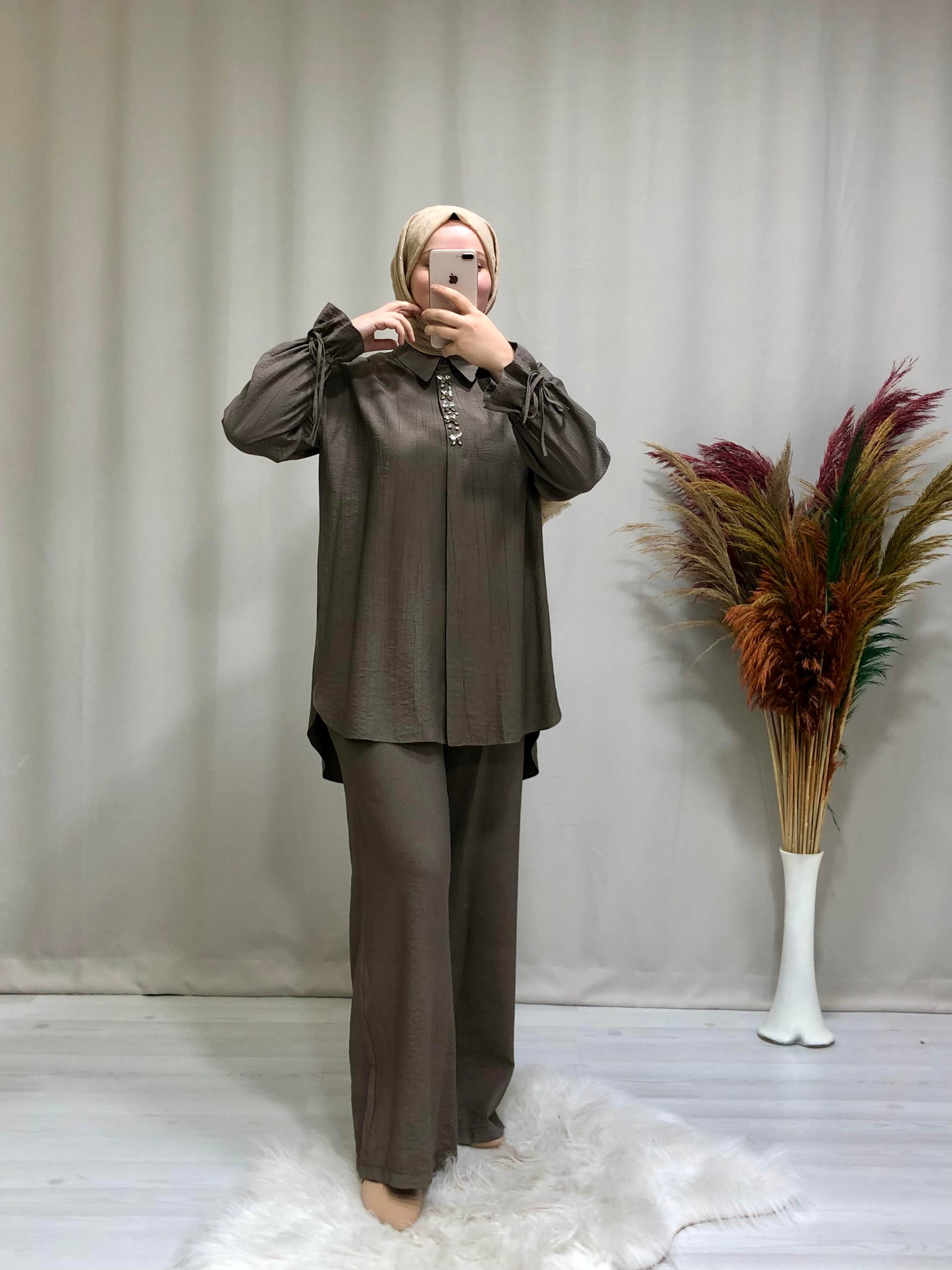 Kadın tesettür ikili takım. Ürünümüz gömlek yaka, önden düğmeli, kolları lastikli bağcık detaylı,