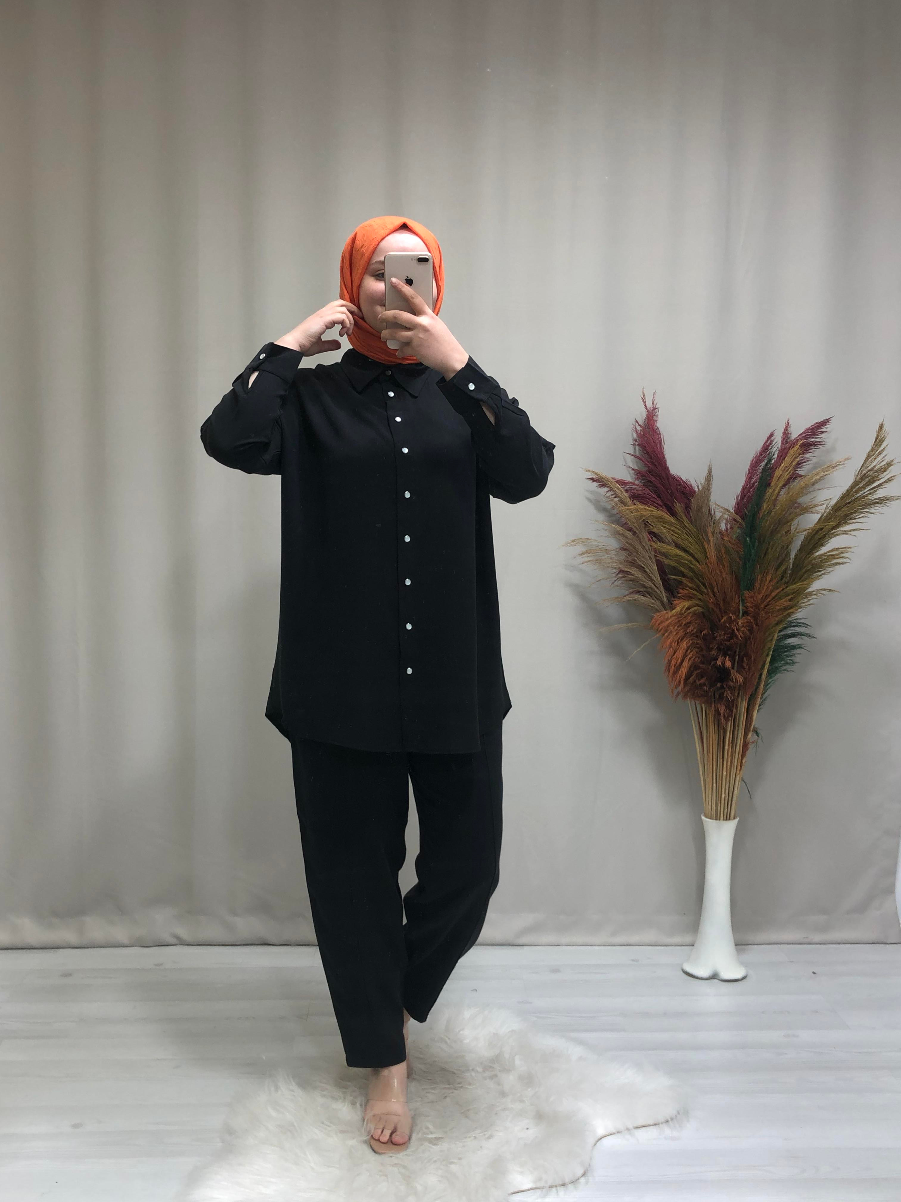 Kadın tesettür keten ikili takım. Ürünümüz gömlek yaka, önden çıt çıt kapamalı, rahat kalıptır.