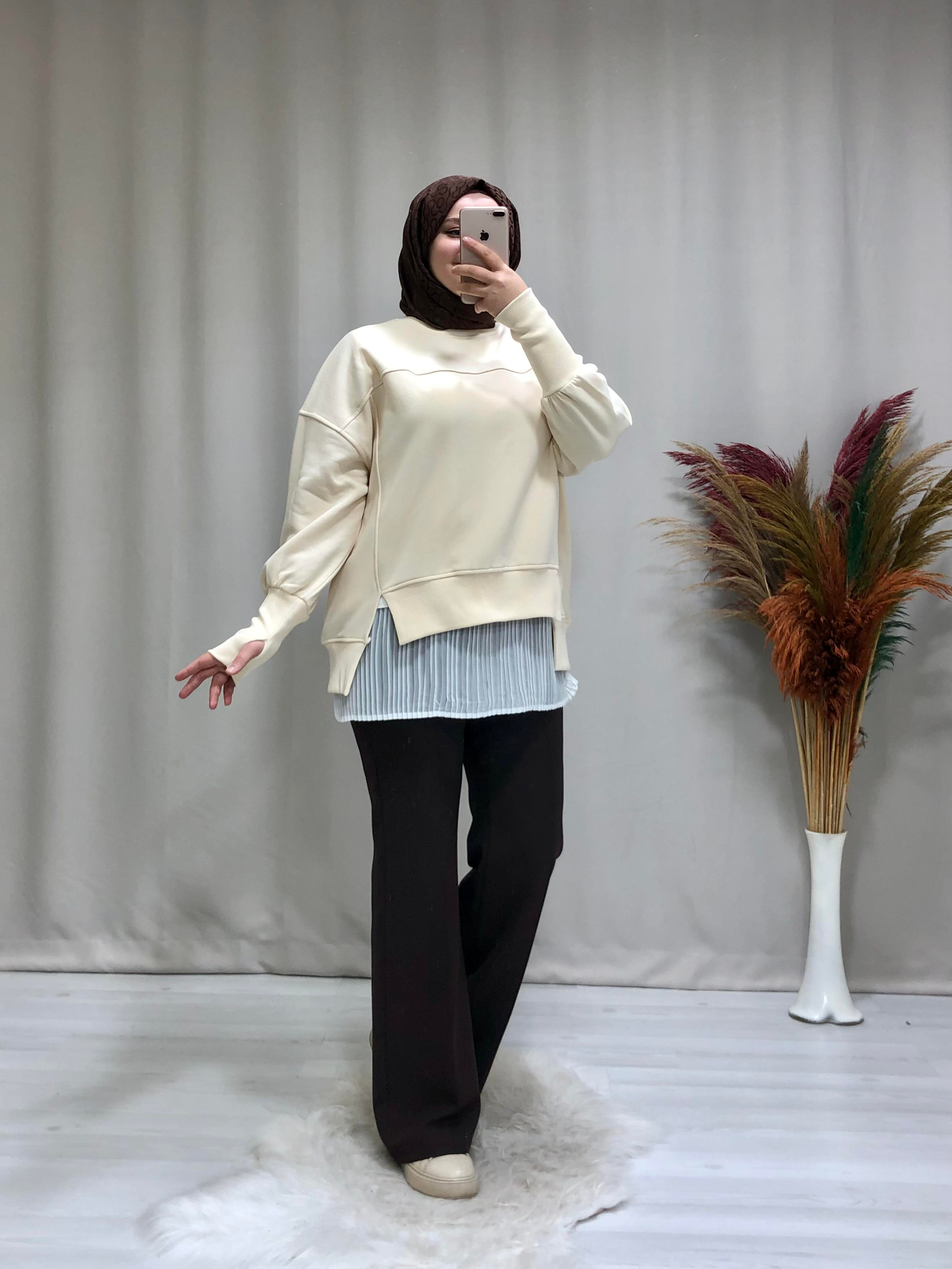 • Kadın tesettür kol detaylı sweat. Ürünümüz önden yırtmaçlı, bisiklet yaka, kollarında parmak geçme detaylı, ön boy kısa arka boy uzun salaş kalıptır.