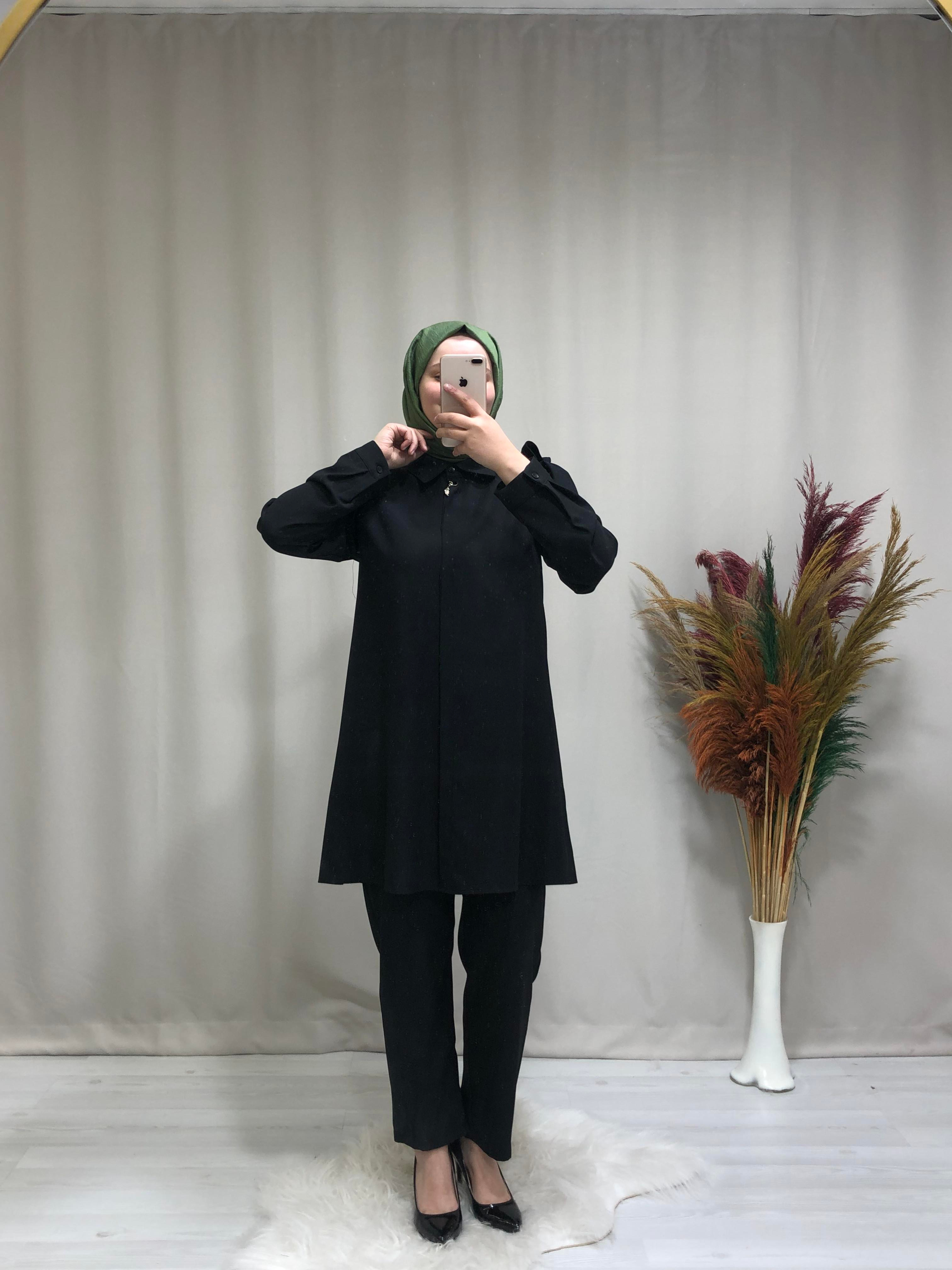 Kadın önden düğmeli krep kumaş ikili takım. Ürünümüz gömlek yaka, omuzları fırfır detaylı gizli düğmeli,pantolon beli lastiklidir.