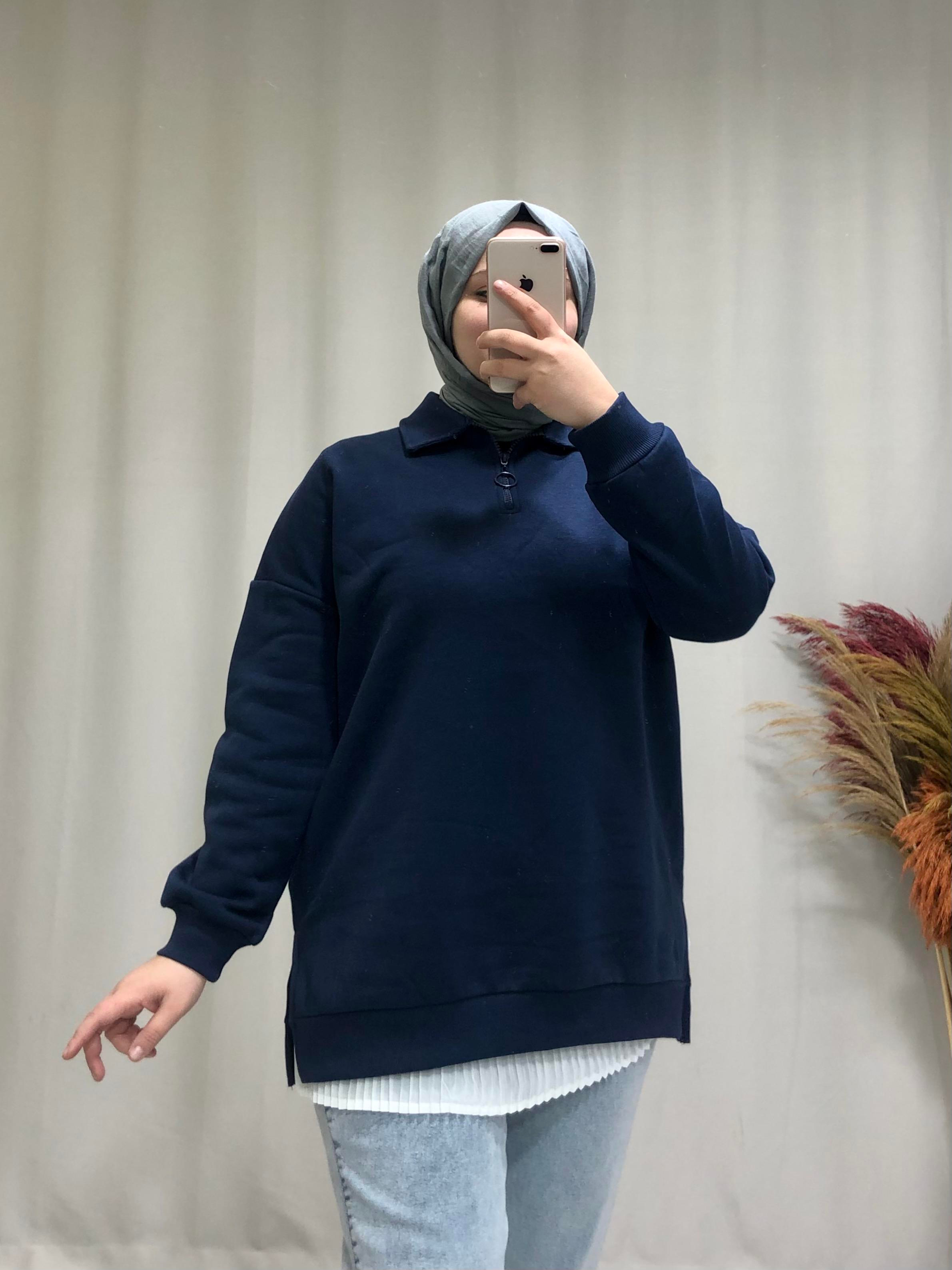 • Kadın tesettür önden fermuar detaylı sweat. Ürünümüz düşük kol, oversize kalıp, yandan yırtmaç detaylıdır.