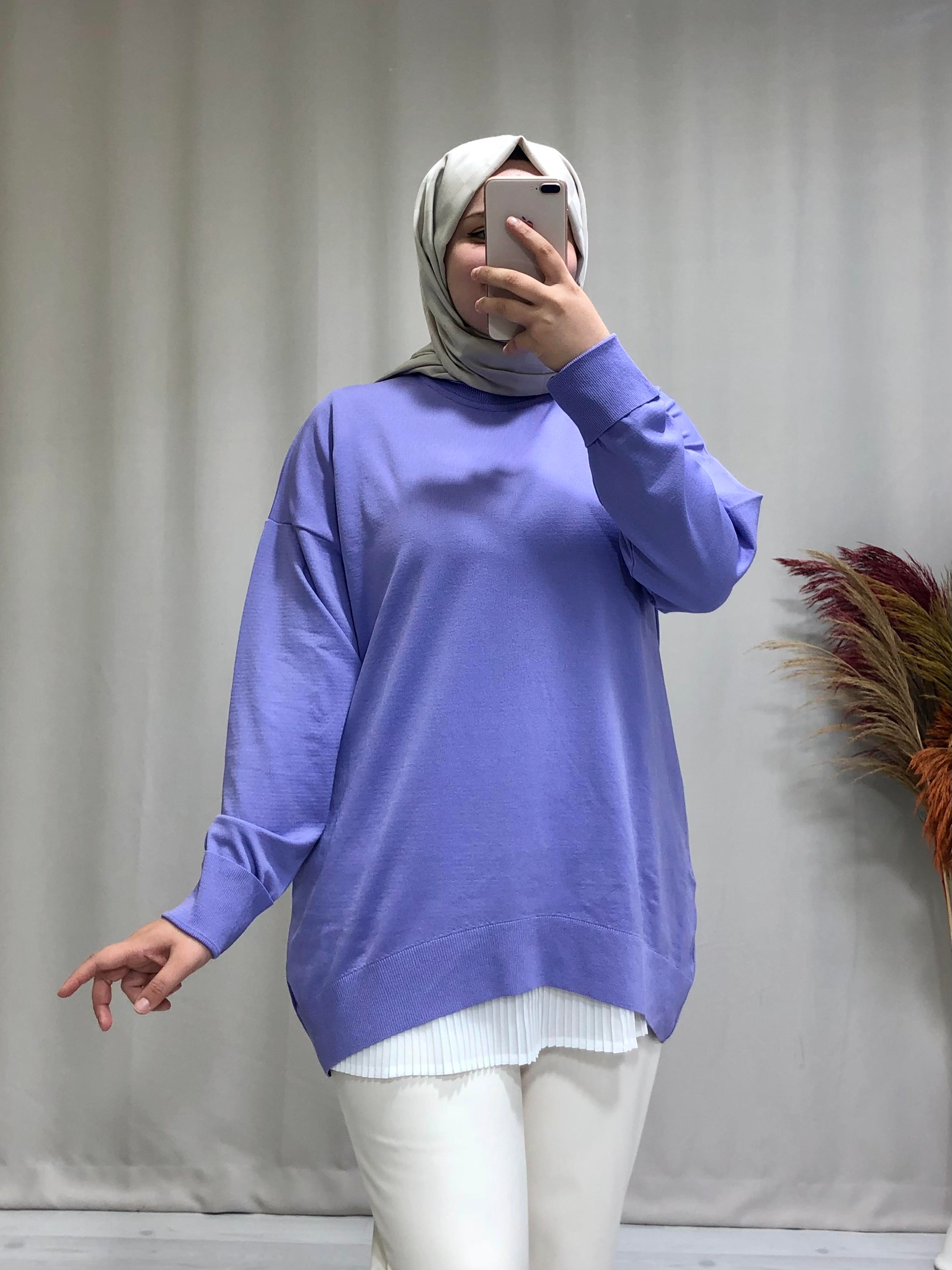 • Kadın tesettür oversize triko kazak. Ürünümüz bisiklet yaka, düşük kollu standart bedendir.