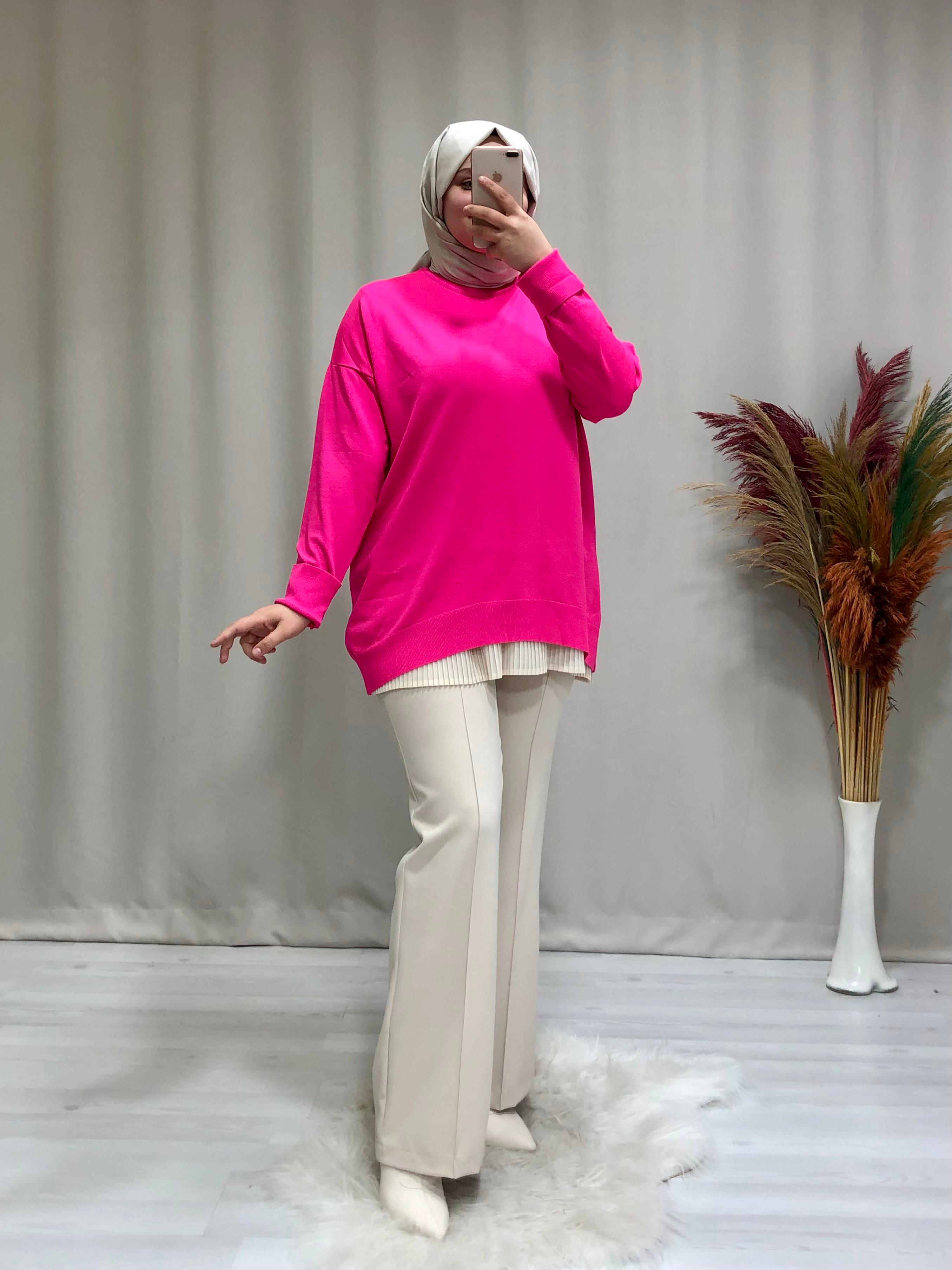 • Kadın tesettür oversize triko kazak. Ürünümüz bisiklet yaka, düşük kollu standart bedendir.