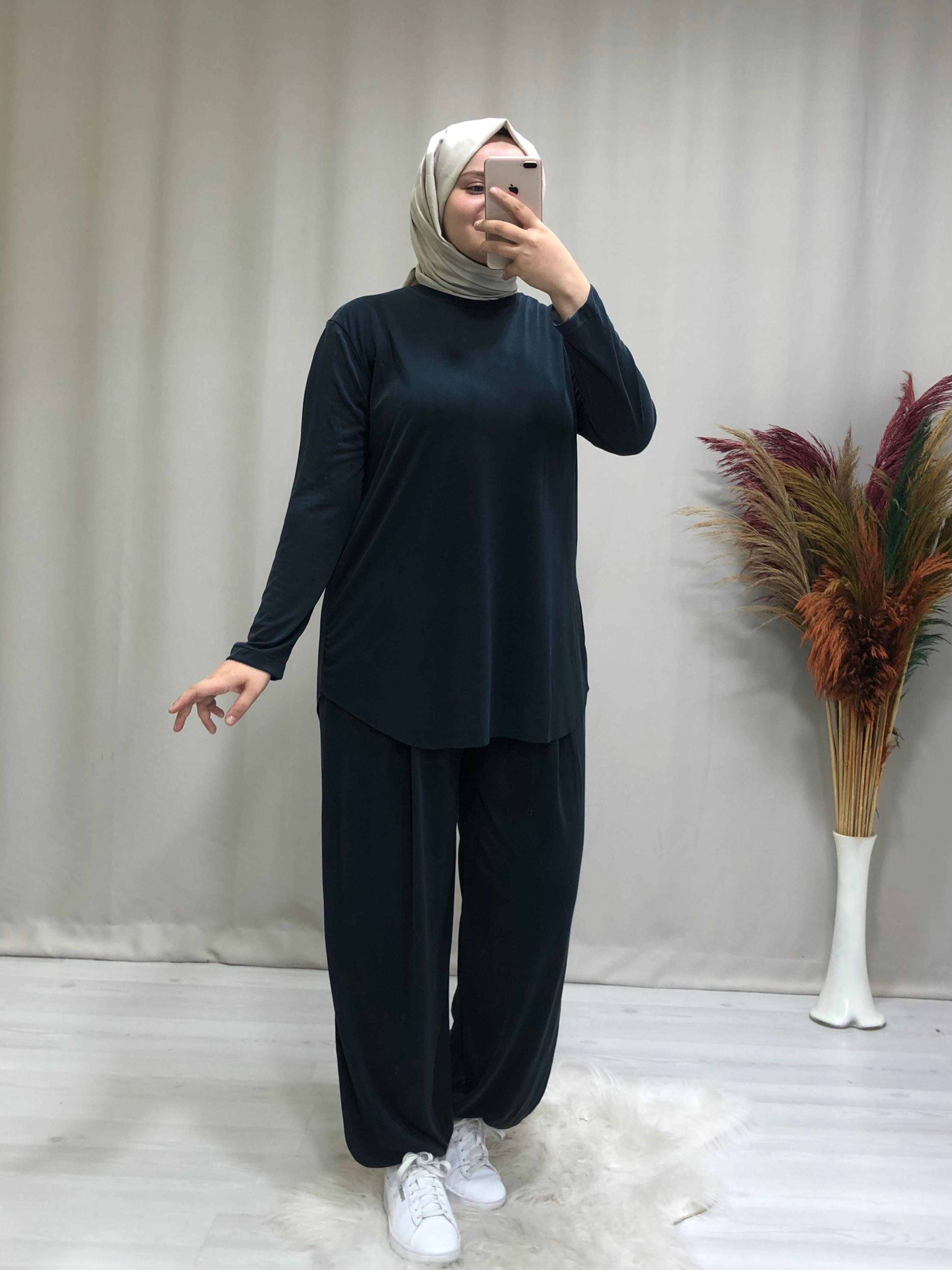 Kadın tesettür oysho kumaş ikili takım. Ürünümüz bisiklet yaka, düşük kollu, pantolon beli lastikli şalvar paça şeklindedir. Bedenlerimiz ( s-m / l- xl ) şeklindedir.