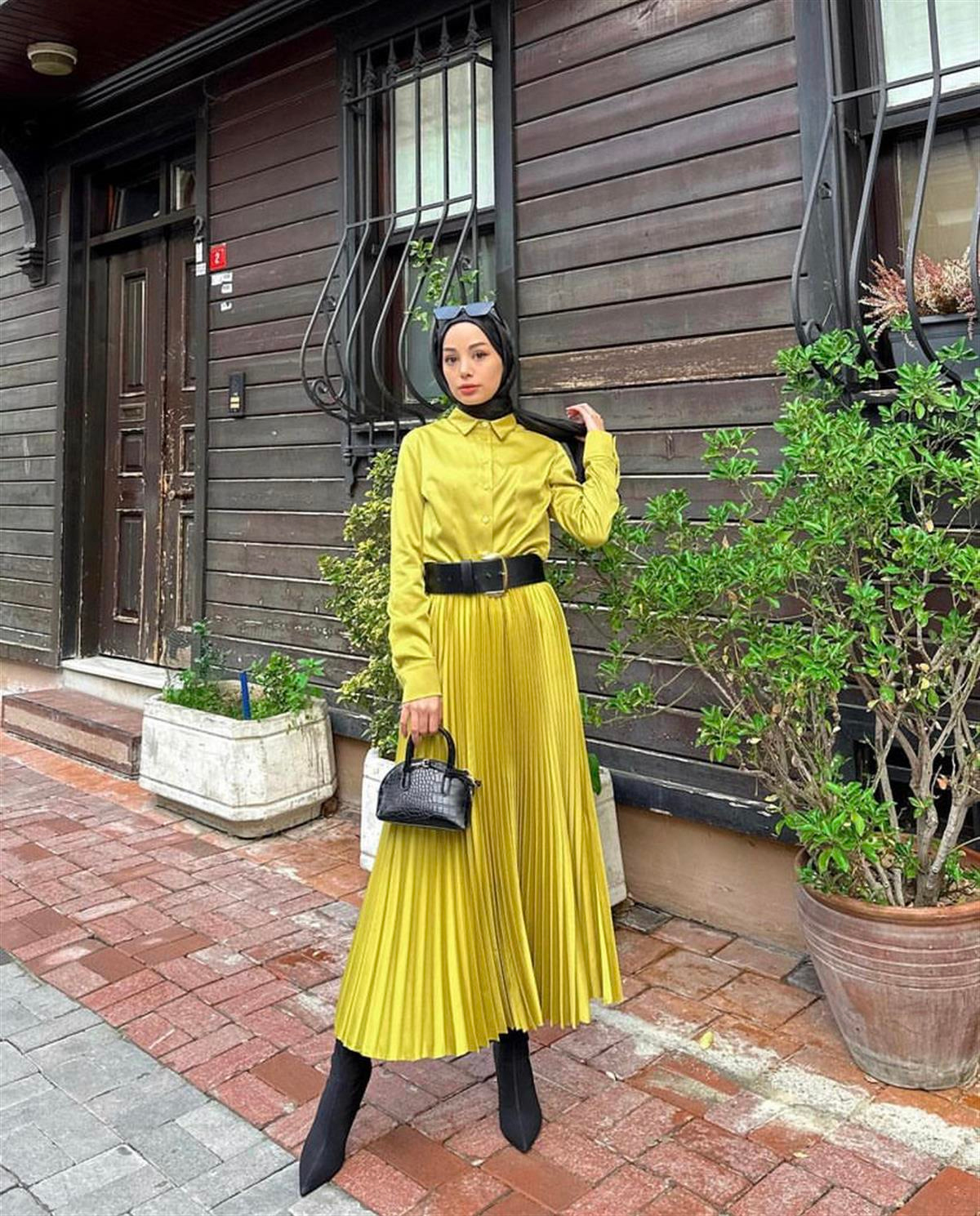 KADIN TESETTÜR PİLİSELİ SATEN ETEK YAĞ YEŞİLİ
