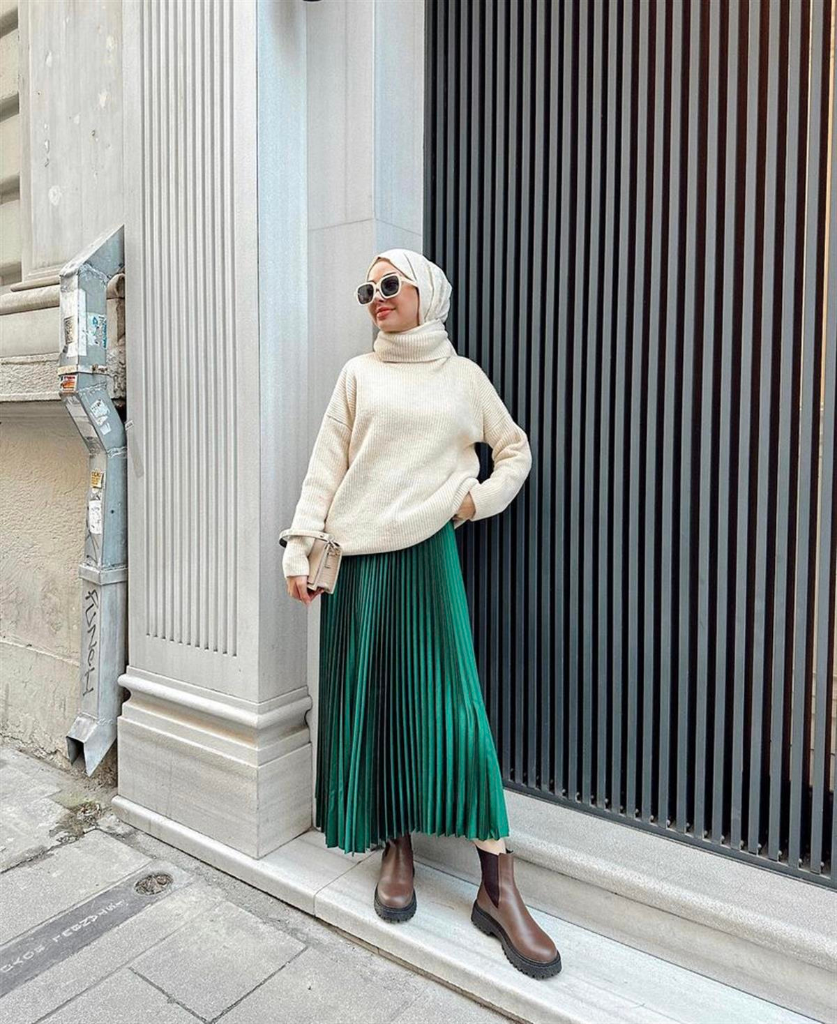 KADIN TESETTÜR PİLİSELİ SATEN ETEK ZÜMRÜT YEŞİLİ