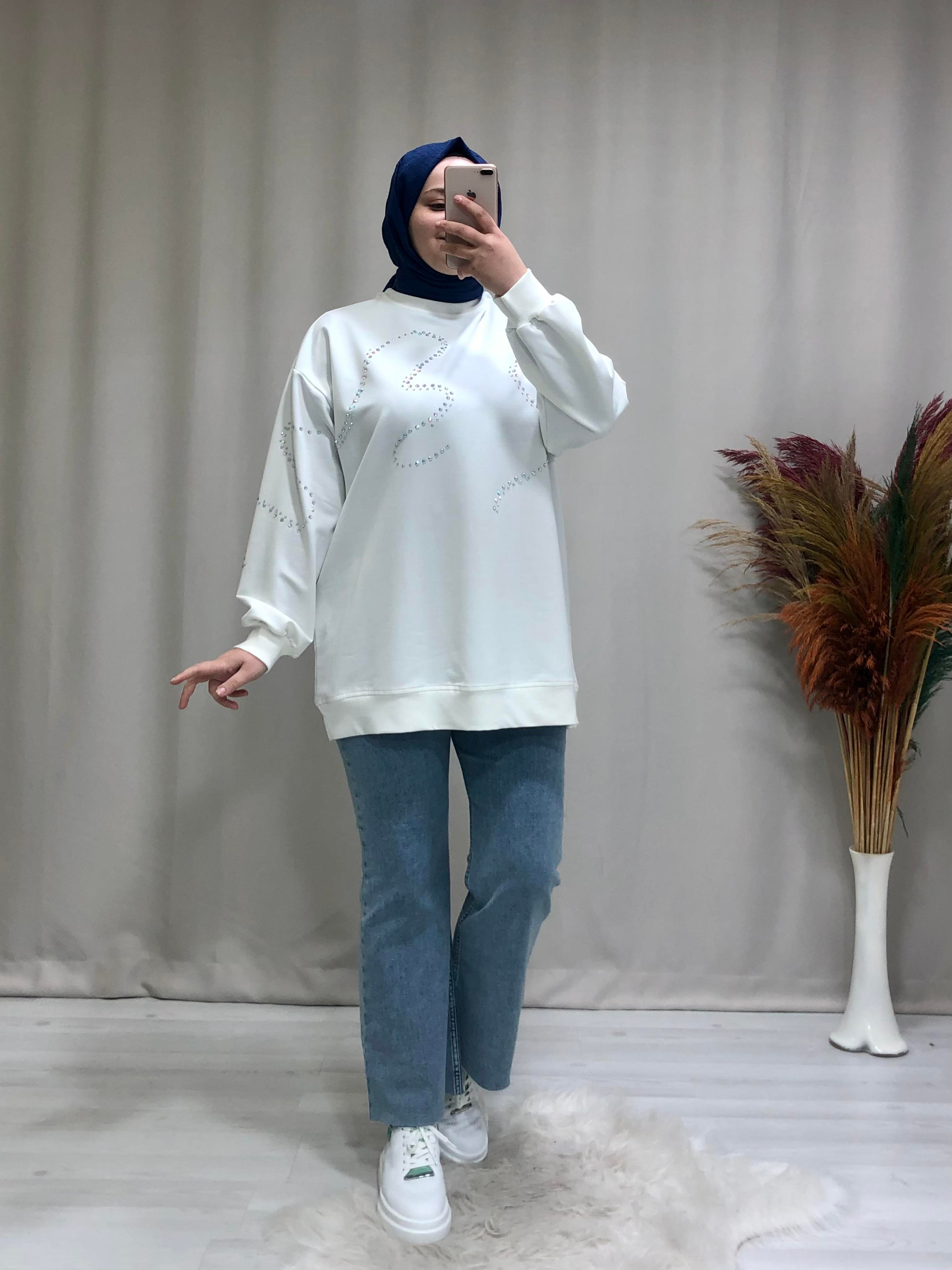 • Kadın tesettür taş detaylı oversize sweat. Ürünümüz bisiklet yaka,  oversize kalıp, düşük kol ve taş baslı detaylıdır.