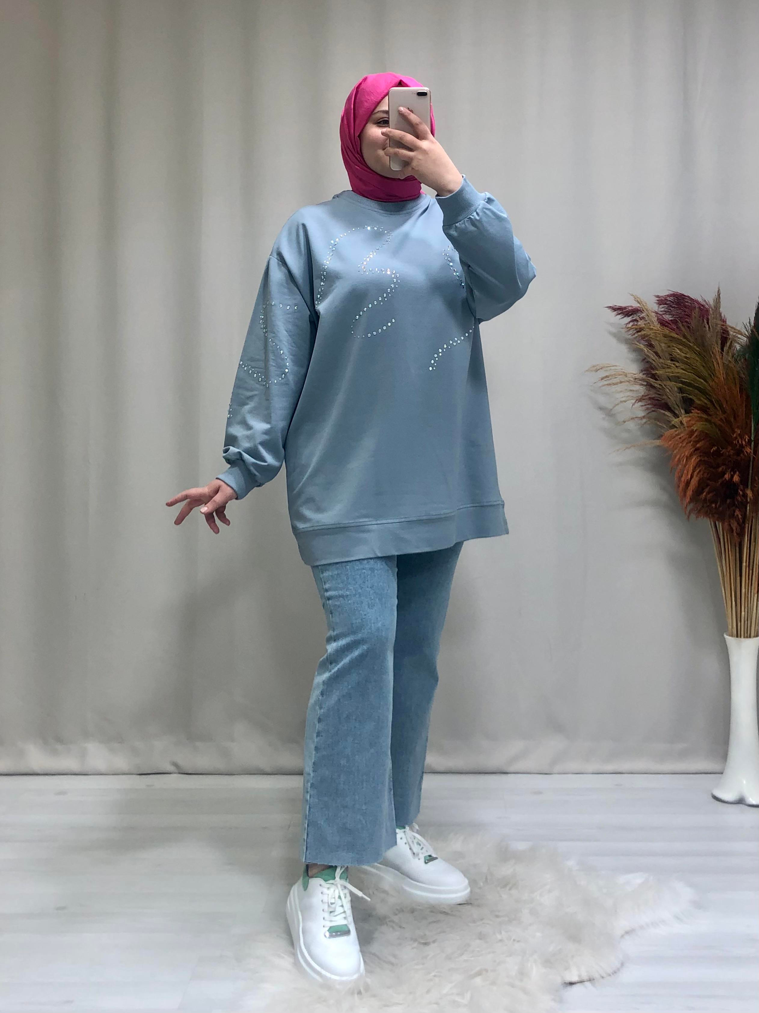 • Kadın tesettür taş detaylı oversize sweat. Ürünümüz bisiklet yaka,  oversize kalıp, düşük kol ve taş baslı detaylıdır.