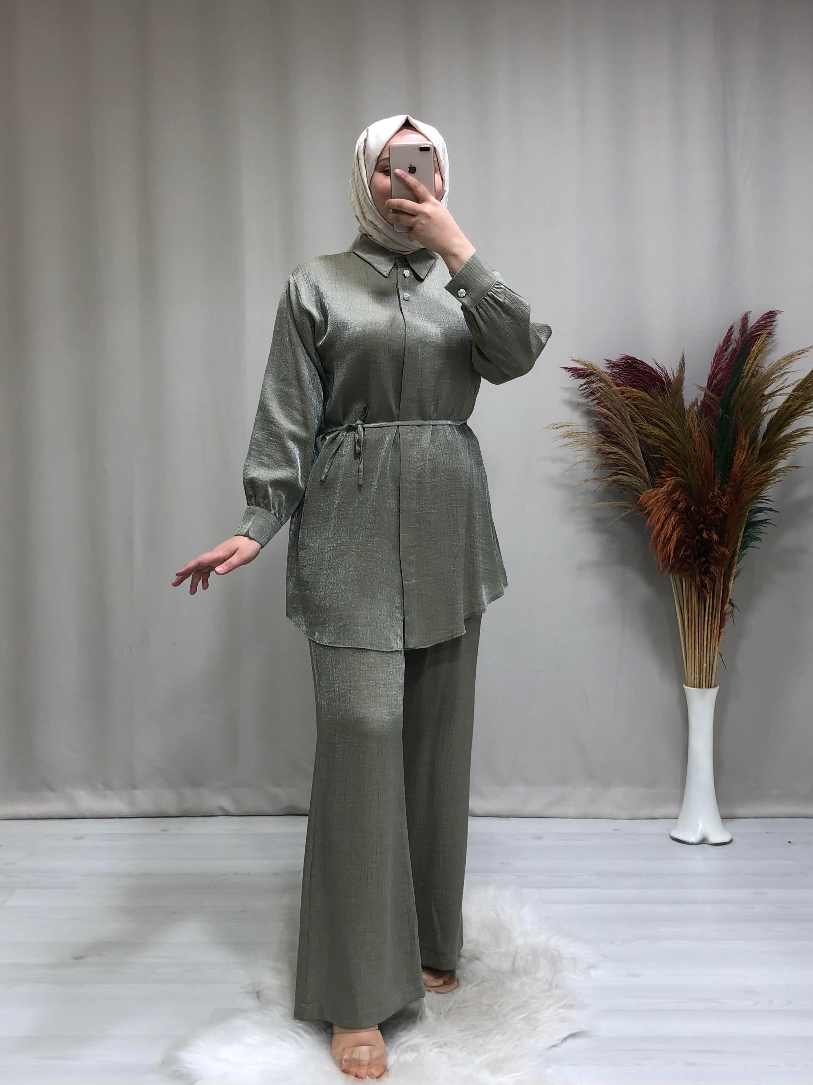 Kadın tesettür taş düğme detaylı ikili takım. Ürünümüz gömlek yaka önden düğmeli taş detaylı, belden bağlamalı salaş kalıptır. Pantolunumuzun beli lastiklidir. 1beden ölçüleri(bedenler arası 2cm oynamaktadır) gömlek uzunluk:80cm göğüs:55cm pantolon boy:105cm basen:55cm