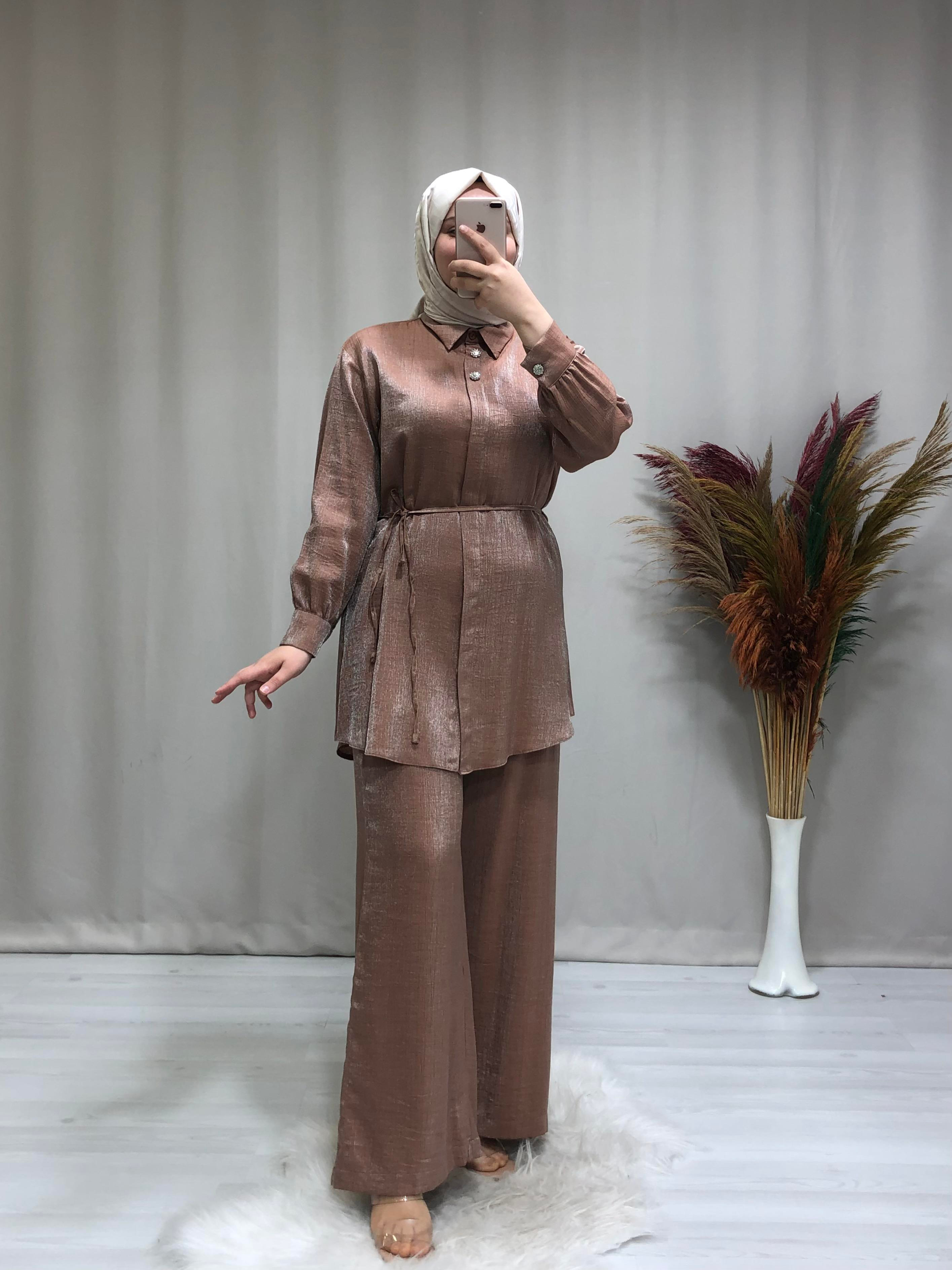 Kadın tesettür taş düğme detaylı ikili takım. Ürünümüz gömlek yaka önden düğmeli taş detaylı, belden bağlamalı salaş kalıptır. Pantolonumuzun beli lastiklidir. 1beden ölçüleri(bedenler arası 2cm oynamaktadır) gömlek uzunluk:80cm göğüs:55cm pantolon boy:105cm basen:55cm
