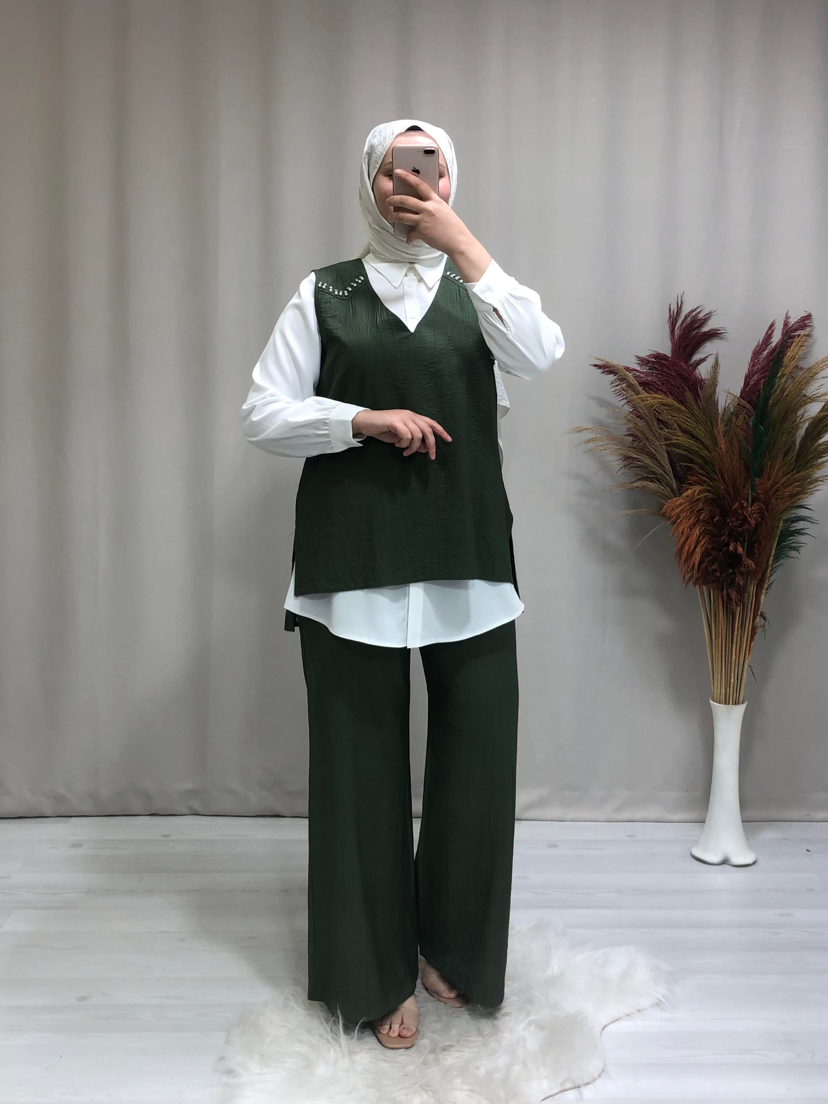 Kadın tesettür üçlü takım. Ürünümüz gömlek yaka, omuzları boncuk detaylıdır.