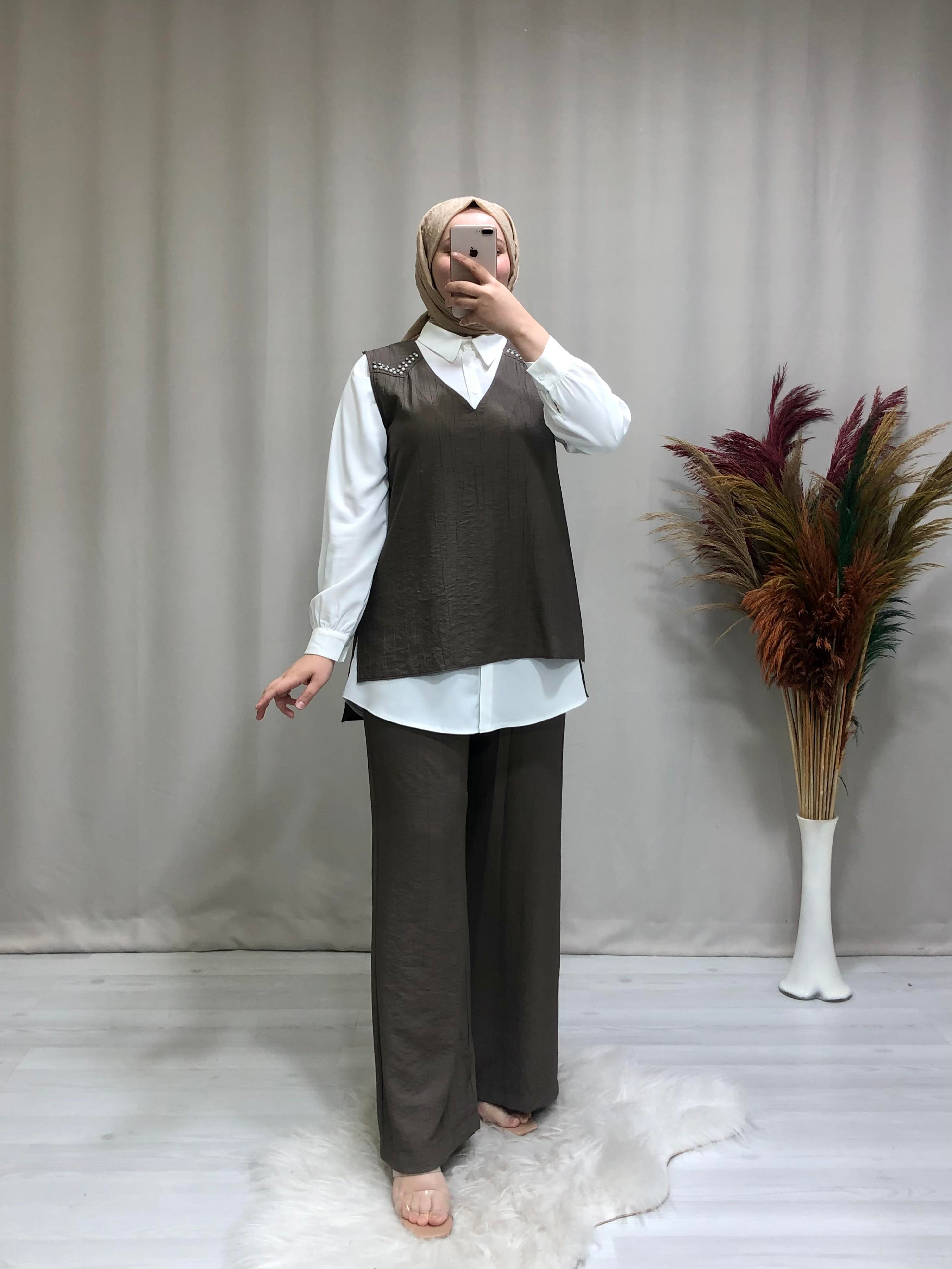 Kadın tesettür üçlü takım. Ürünümüz gömlek yaka, omuzları boncuk detaylıdır.