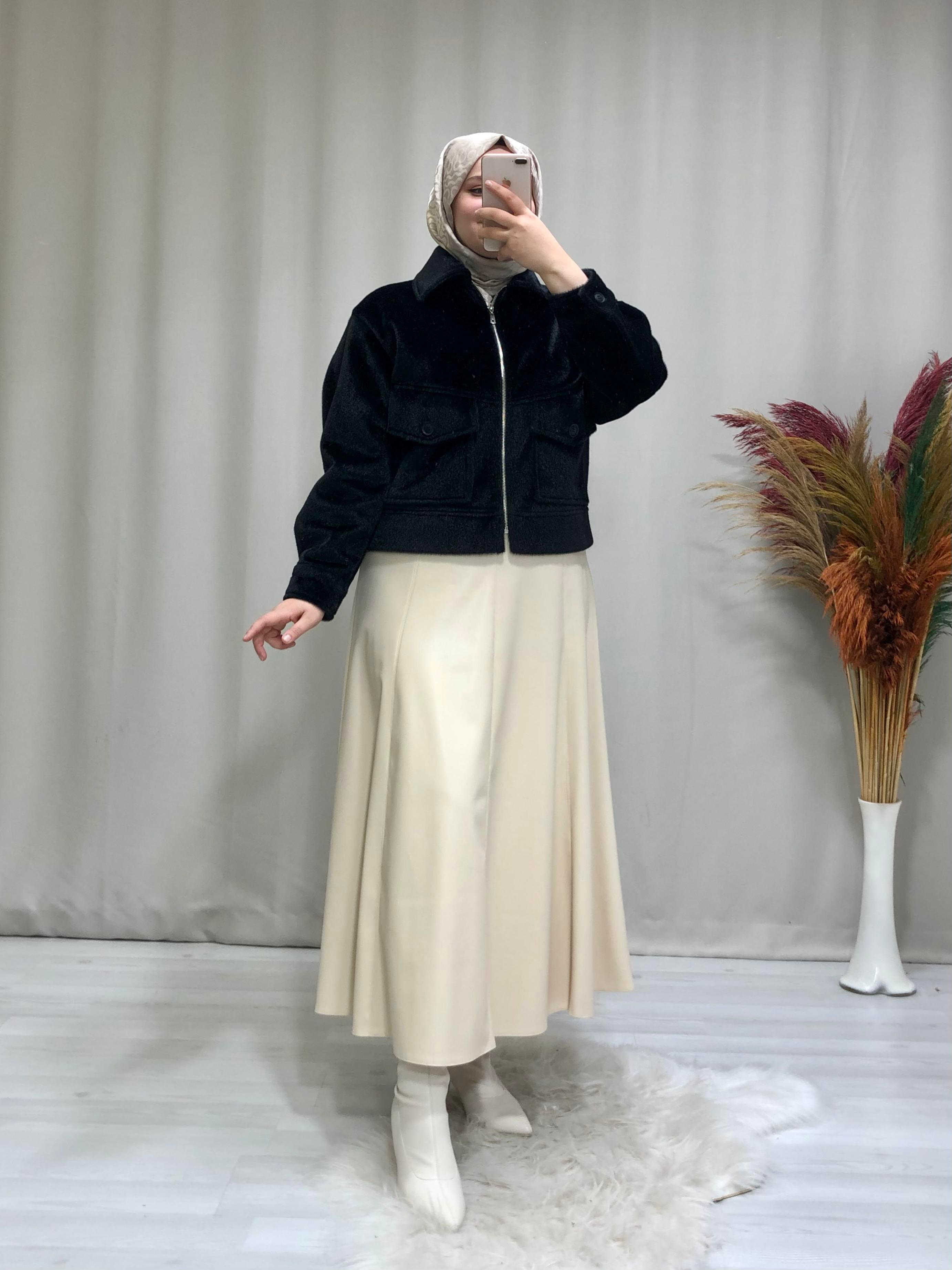 • Kadın tesettür verev kesim fermuarlı ceket. Ürünümüz önden fermuarlı, gömlek yaka,  cep detaylıdır.