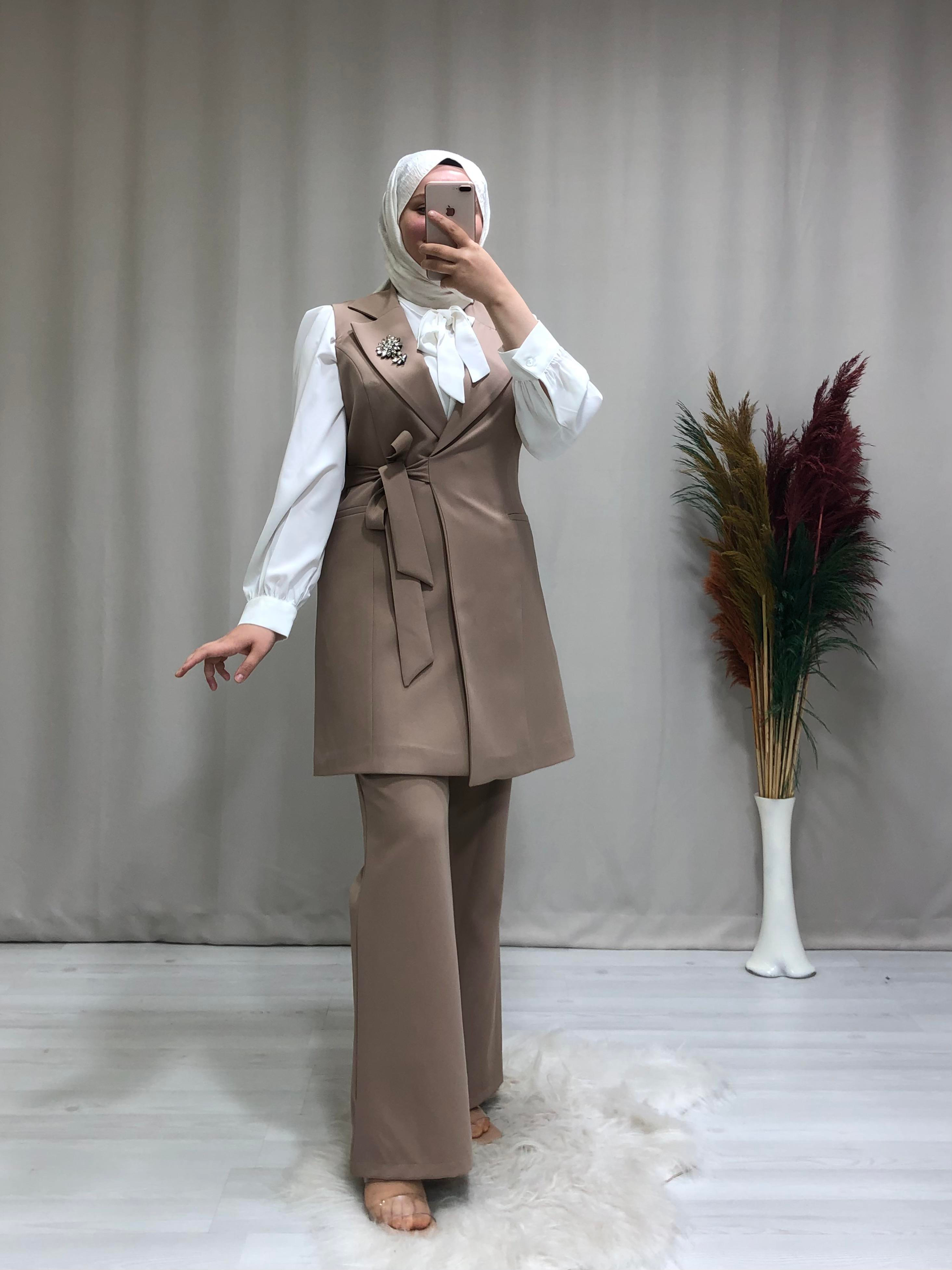 KADIN TESETTÜR 3'LÜ YELEKLİ TAKIM YENİ SEZON ÜRÜNÜDÜR ÜRÜNÜMÜZ 3 PARÇADAN OLUŞMAKTADIR; GÖMLEK YELEK VE PANTOLON ŞEKLİNDE ROZET ÜRÜNE DAHİLDİR, PANTOLON BELİ LASTİKLİDİR,YELEK ASTARLIDIR GÖMLEK KREP KUMAŞTIR, GİZLİ DÜĞMELİDİR GÖMLEK BOY: 63 CM YELEK BOY: 88 CM PANTOLON BOY:105 CM