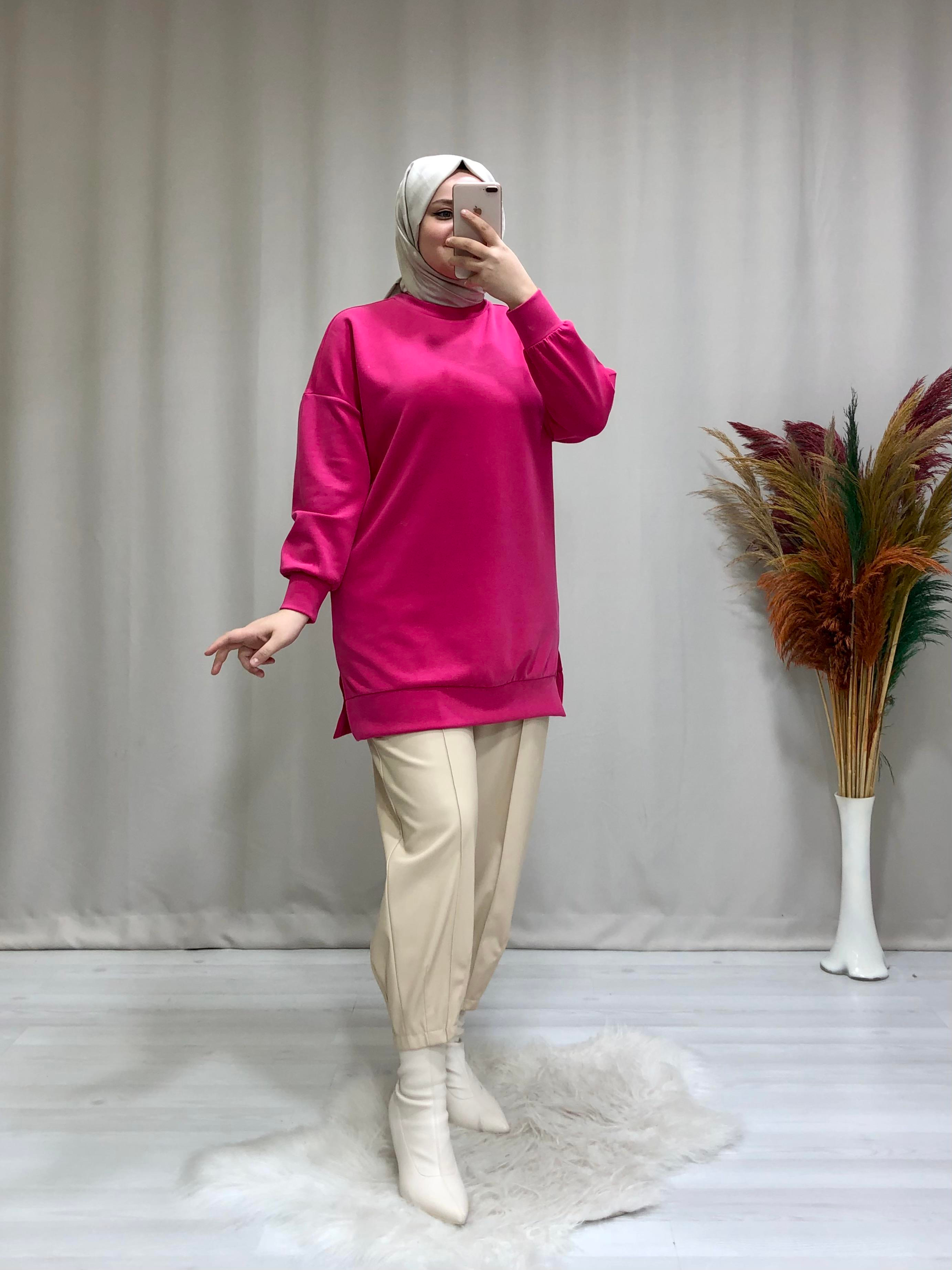 • Kadın tesettür yırtmaç detaylı sweat. Ürünümüz bisiklet yaka, modal kumaş ,salaş kesimdir.