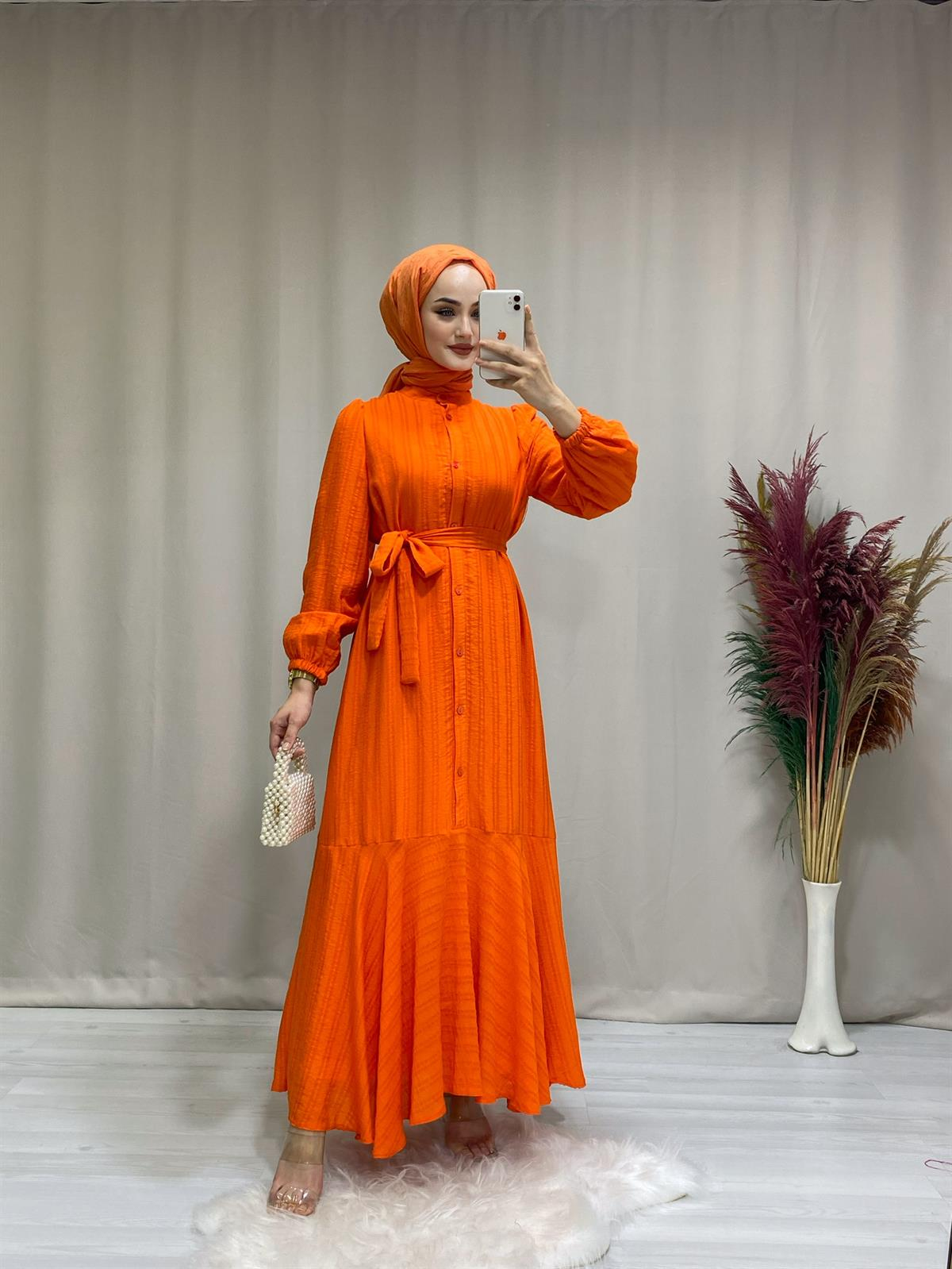 KADIN TURUNCU KETEN KUMAŞ TESETTÜR YAZLIK ELBİSE
