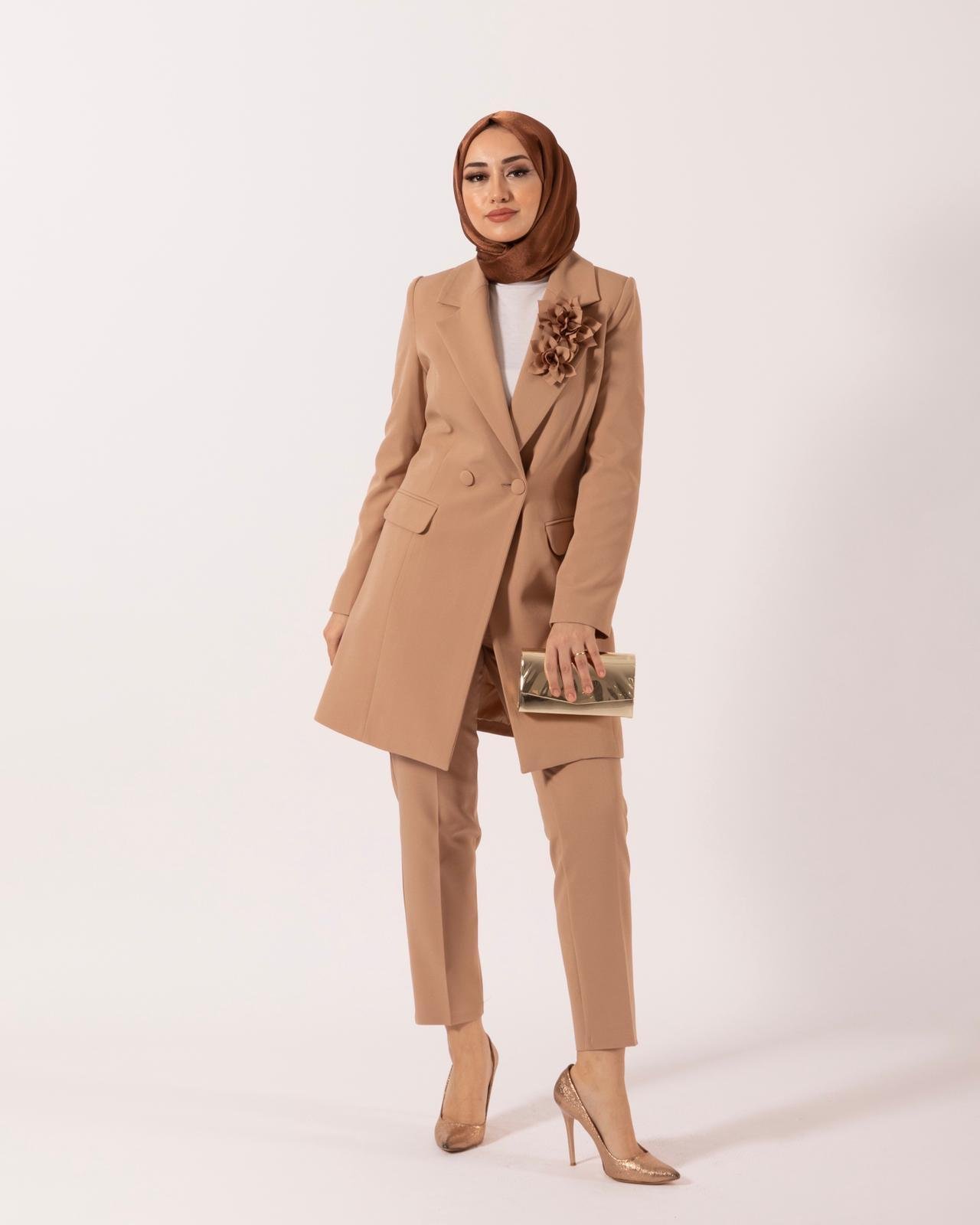 Kadın yaka detaylı tesettür blazer takım.Ürünümüzün ceketi kruvaze yaka,önden düğmeli, cepli. Ürünümüzün altı beli lastikli,cepsiz ve kalem modeldir.