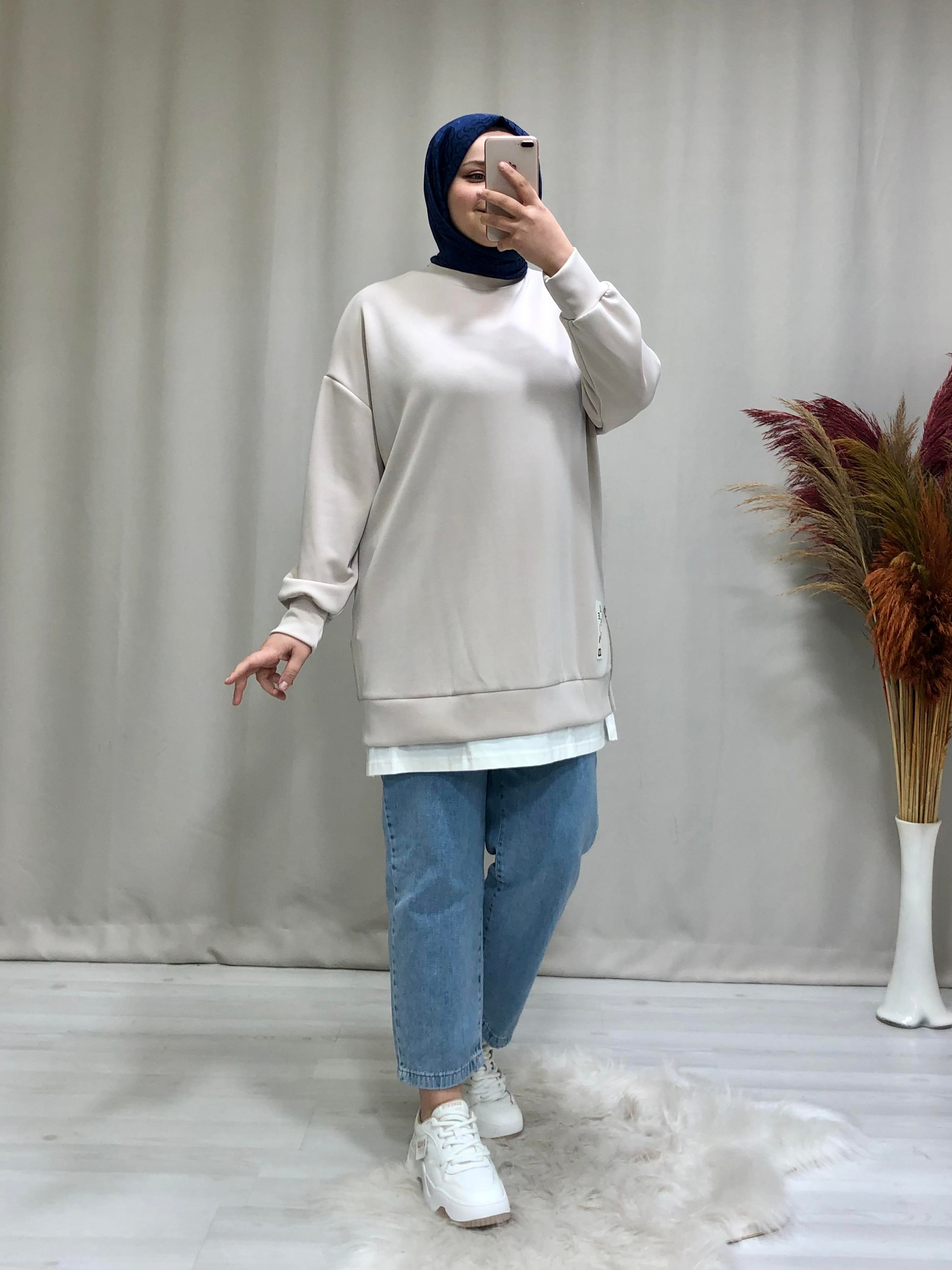 • Kadın yandan fermuar detaylı tesettür sweat. Ürünümüz bisiklet yaka, yandan fermuar detaylı salaş kalıptır.