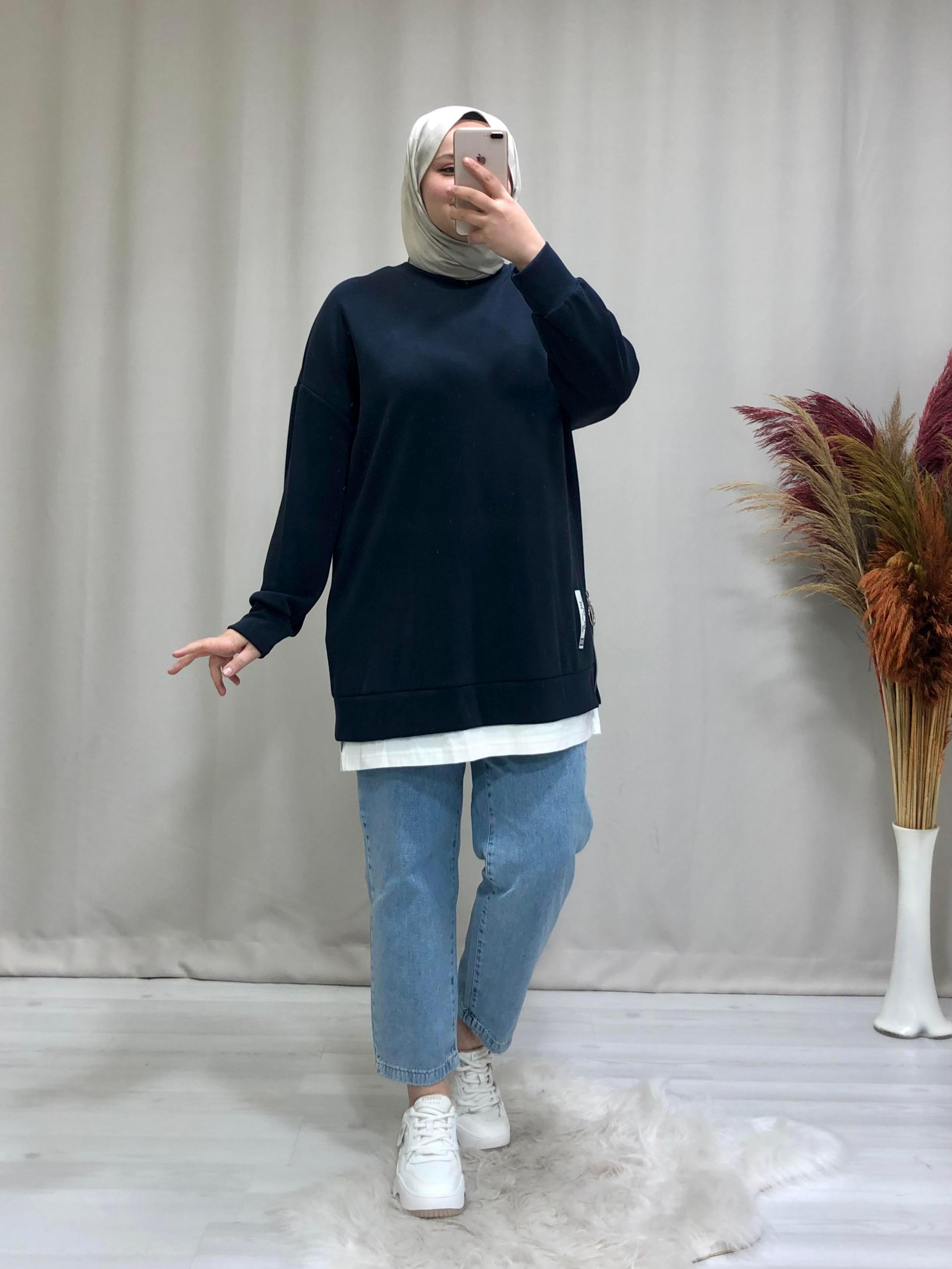 • Kadın yandan fermuar detaylı tesettür sweat. Ürünümüz bisiklet yaka, yandan fermuar detaylı salaş kalıptır.