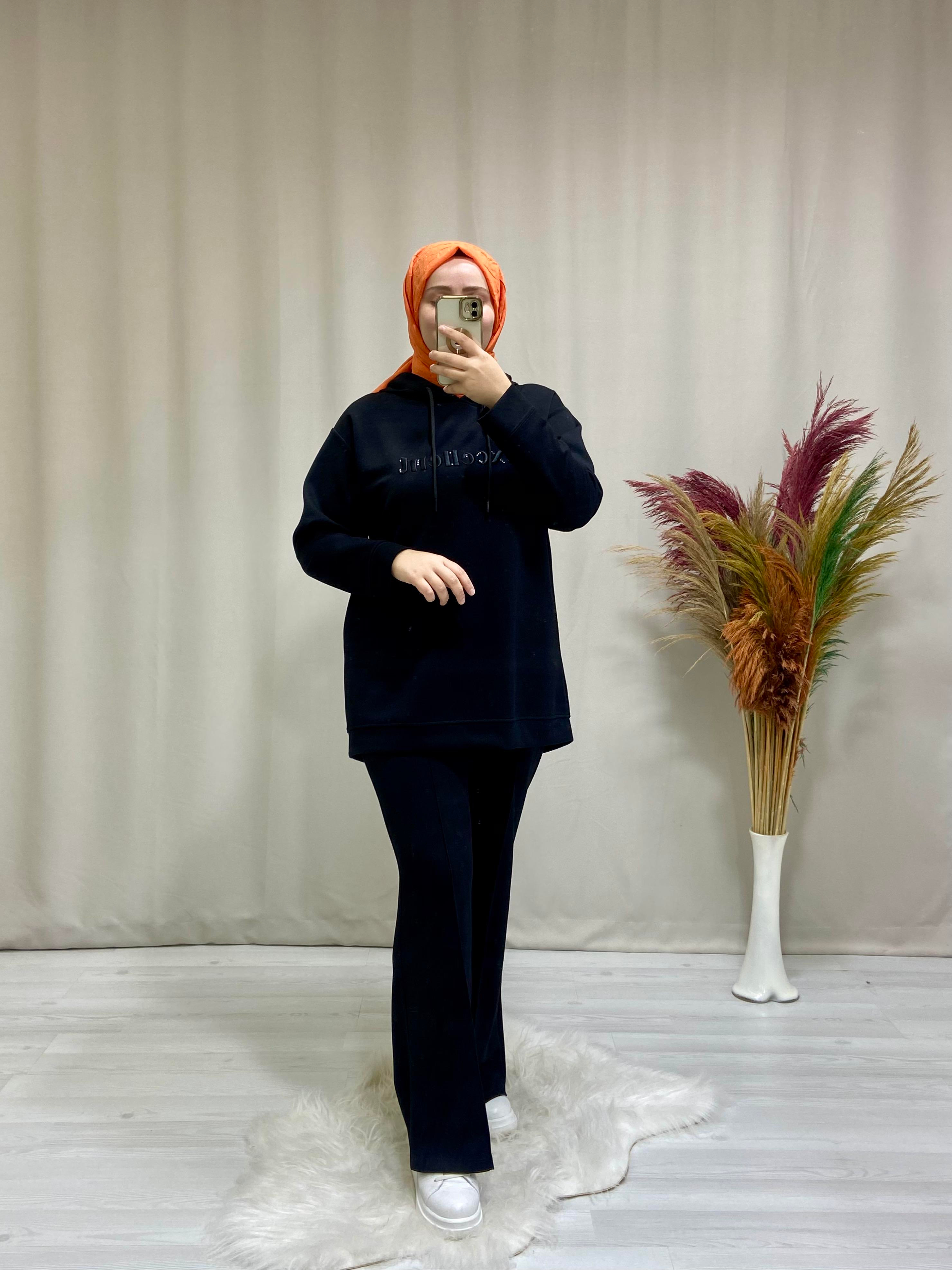 Kadın önü yazı detaylı kapüşonlu 2 iplik şardonsuz tesettür eşofman takımı.