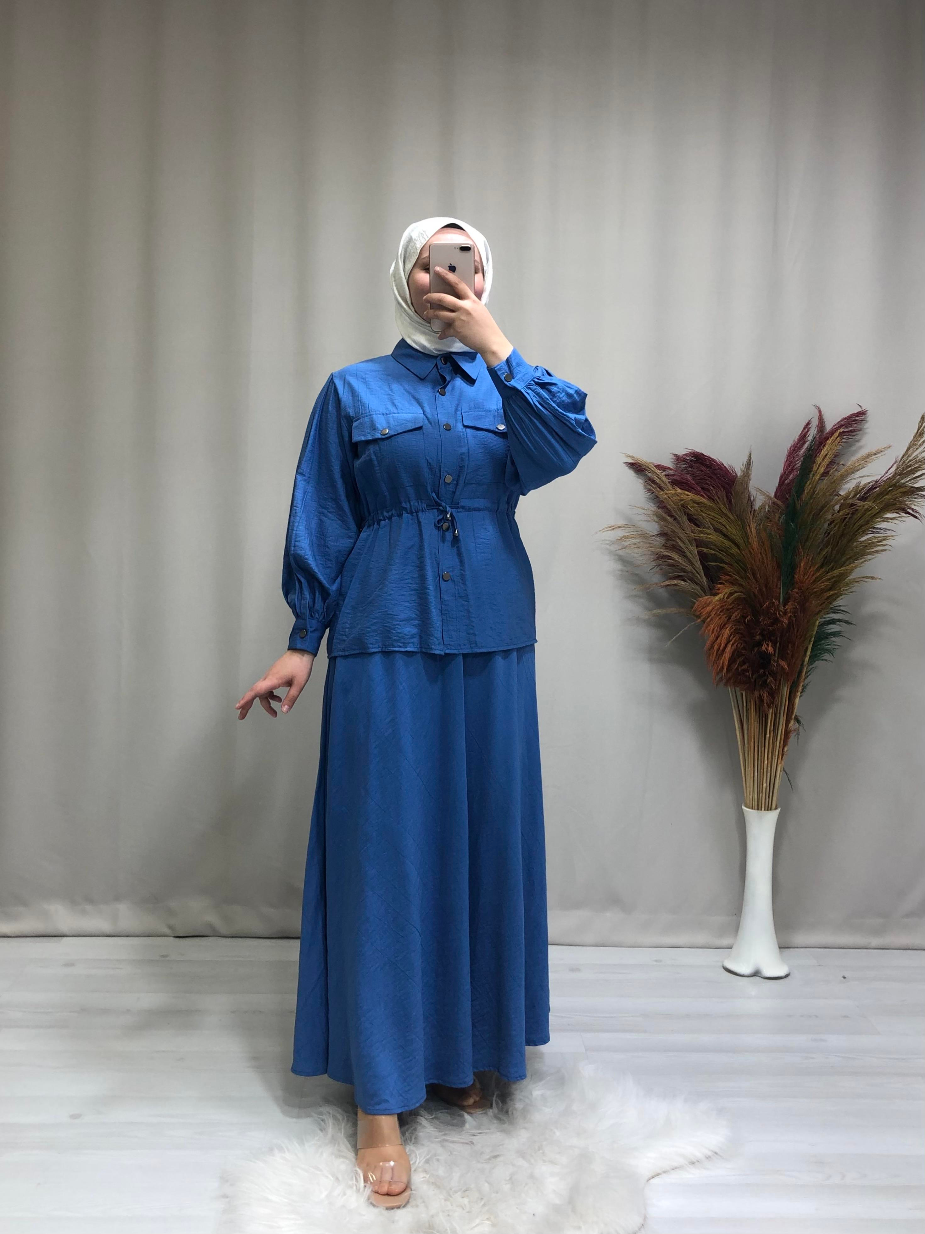 Kadın yazlık etekli tesettür  ikili takım. Ürünümüz gömlek yaka, önden çıtçıt kapamalı, iki cep detaylı, belden büzgülü, eteğimizin belli lastikli, kloş şekilde  inmektedir.