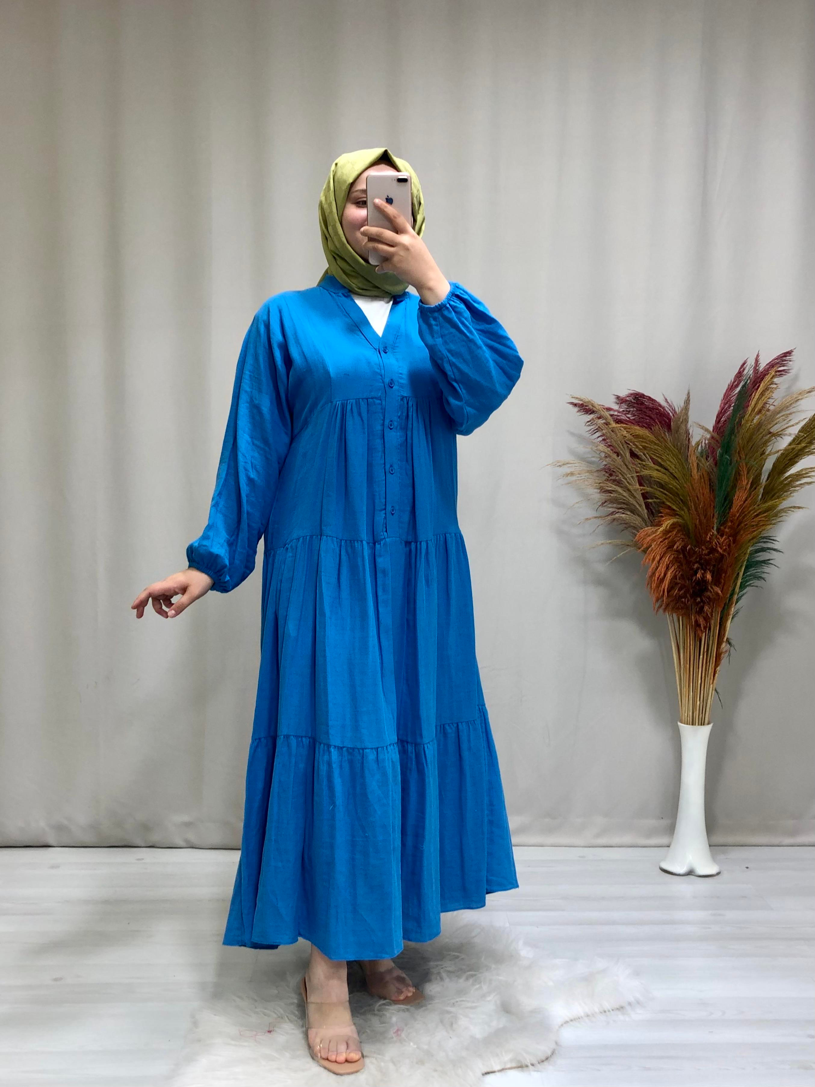• Kadın yazlık  müslin kumaş tesettür elbise. Ürünümüz  v yaka önden yarım düğme kapalmalı,  oversize kalıp,  müslin kumaş,  36-46 bedene kadar uyumludur.