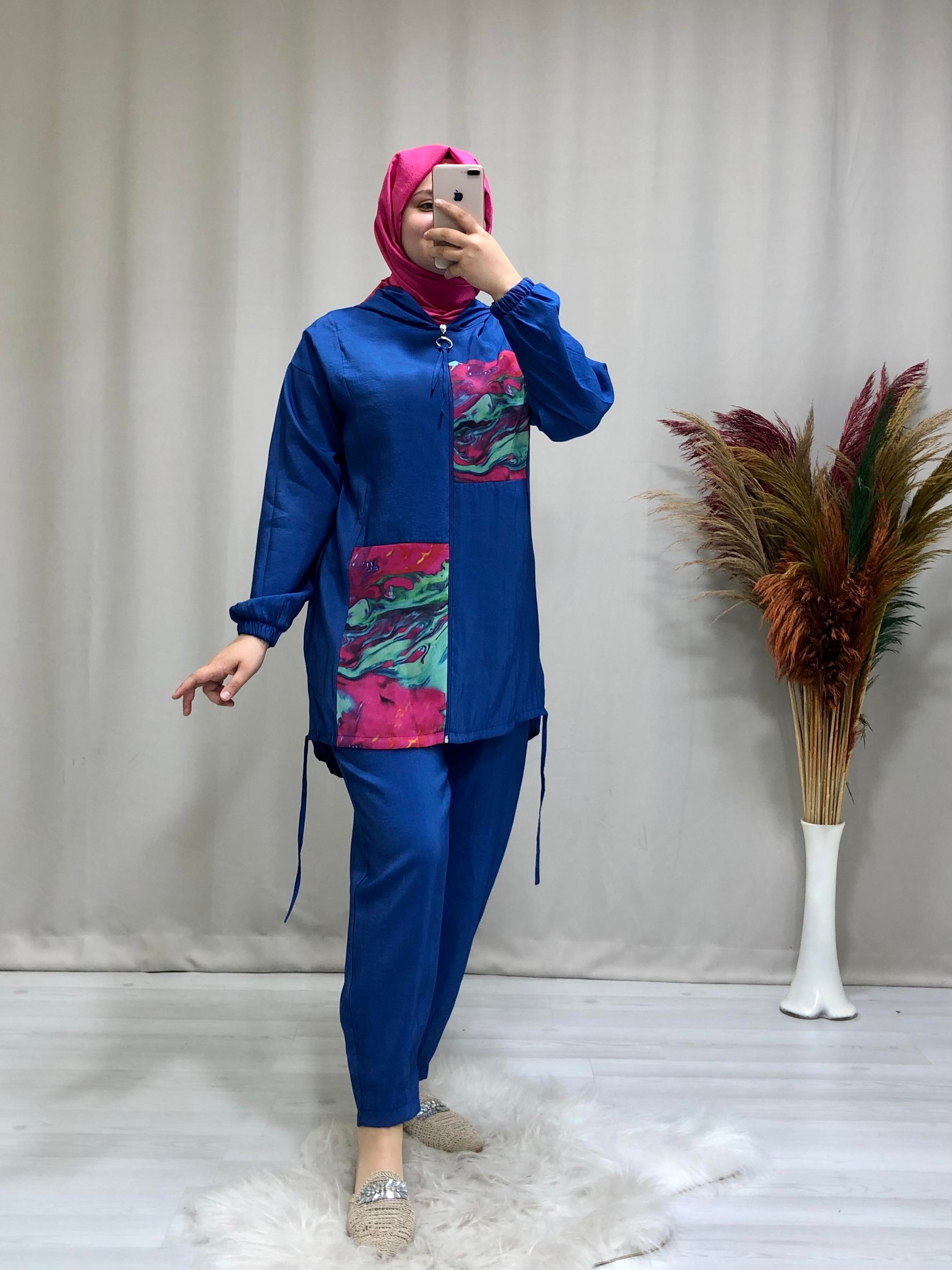 • Kadın yazlık önden fermuarlı  tesettür takım. Ürünümüz kapşönlü,  kolları lastikli , önden fermuarlı , modal kumaş, tunik etek ucları ayarlanabilir lastik detaylı, pantolon beli lastikli, havuç paça şeklindedir.