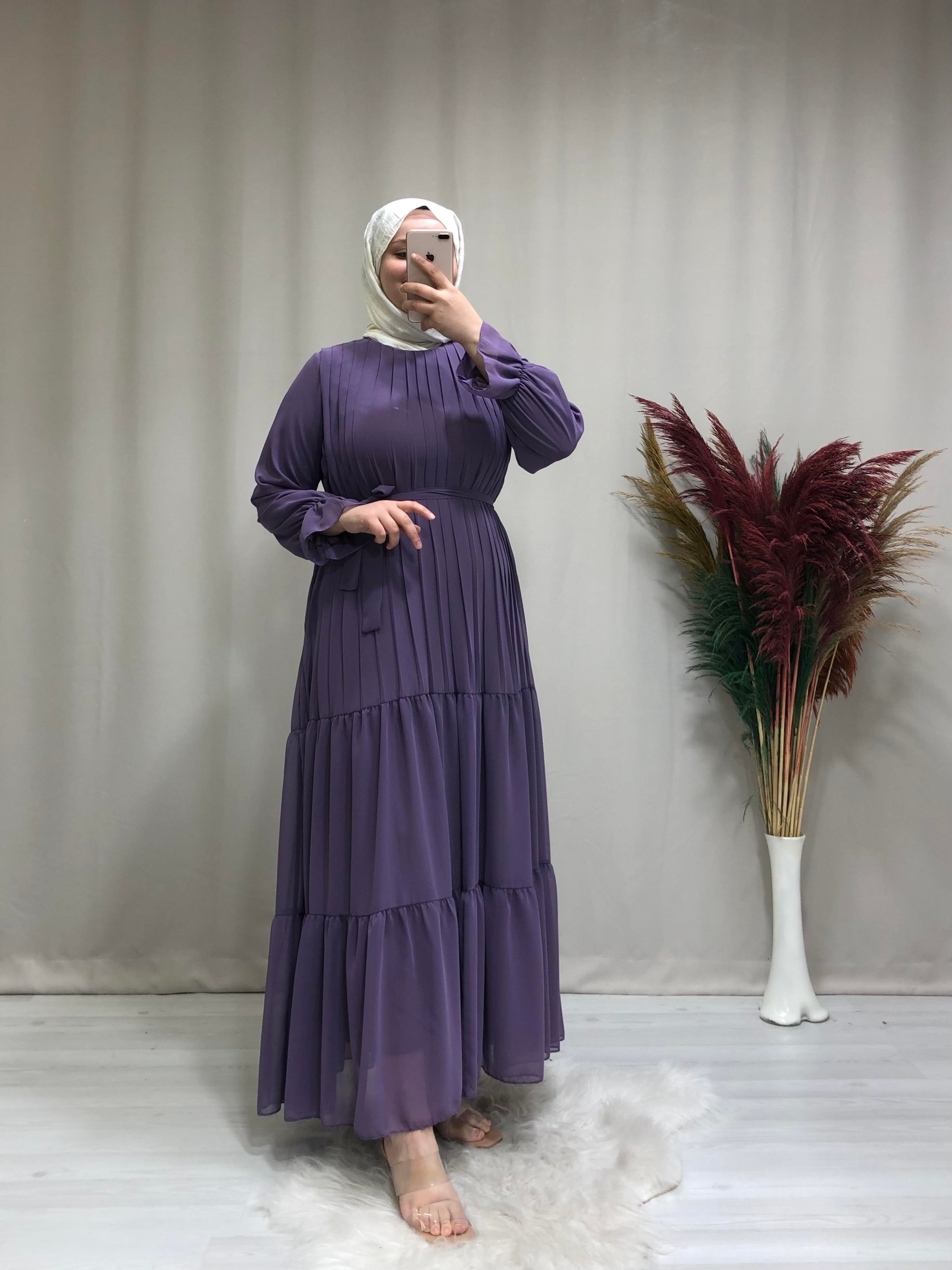 Kadın yazlık şifon fırfırlı detaylı tesettür elbise. Ürünümüz bisiklet yaka, kolları ve etek ucları fırfır detaylı, belden kuşaklı,