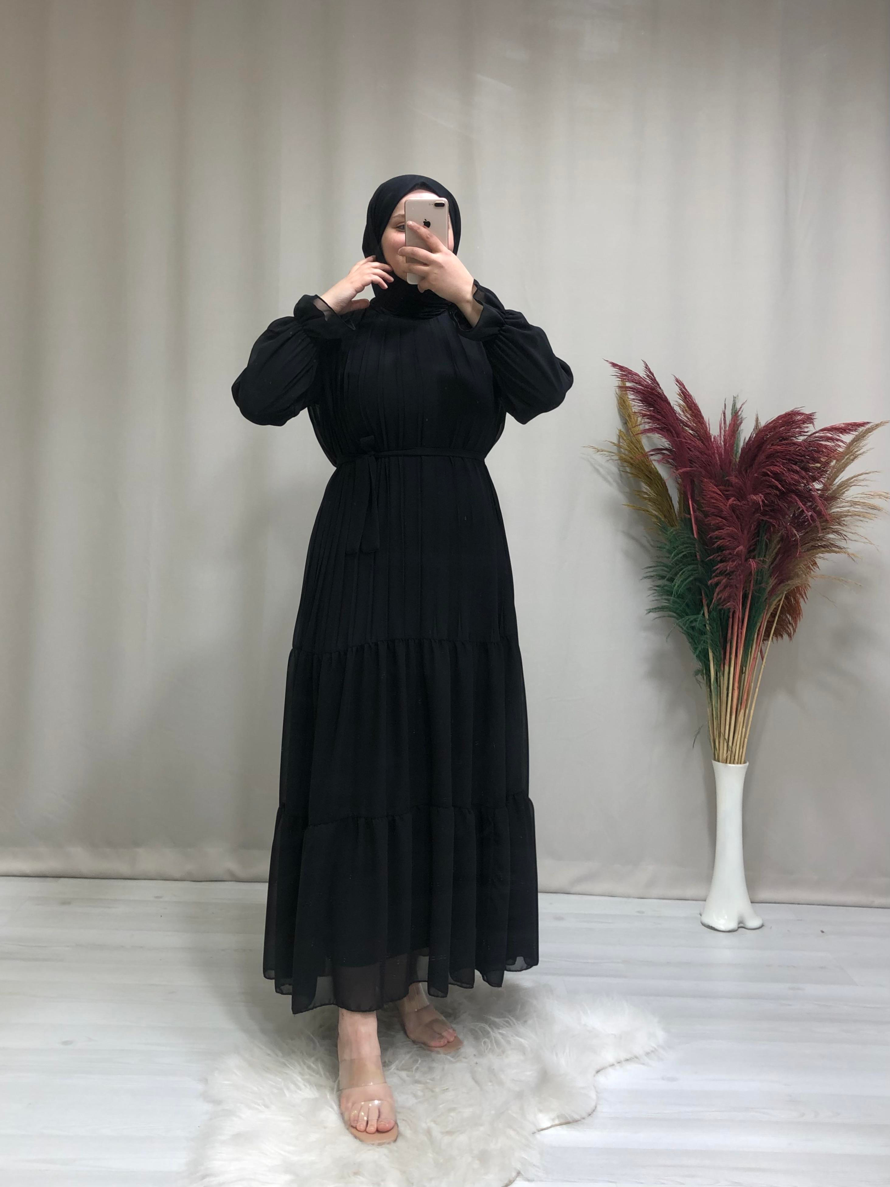 Kadın yazlık şifon fırfırlı detaylı tesettür elbise. Ürünümüz bisiklet yaka, kolları ve etek ucları fırfır detaylı, belden kuşaklı,