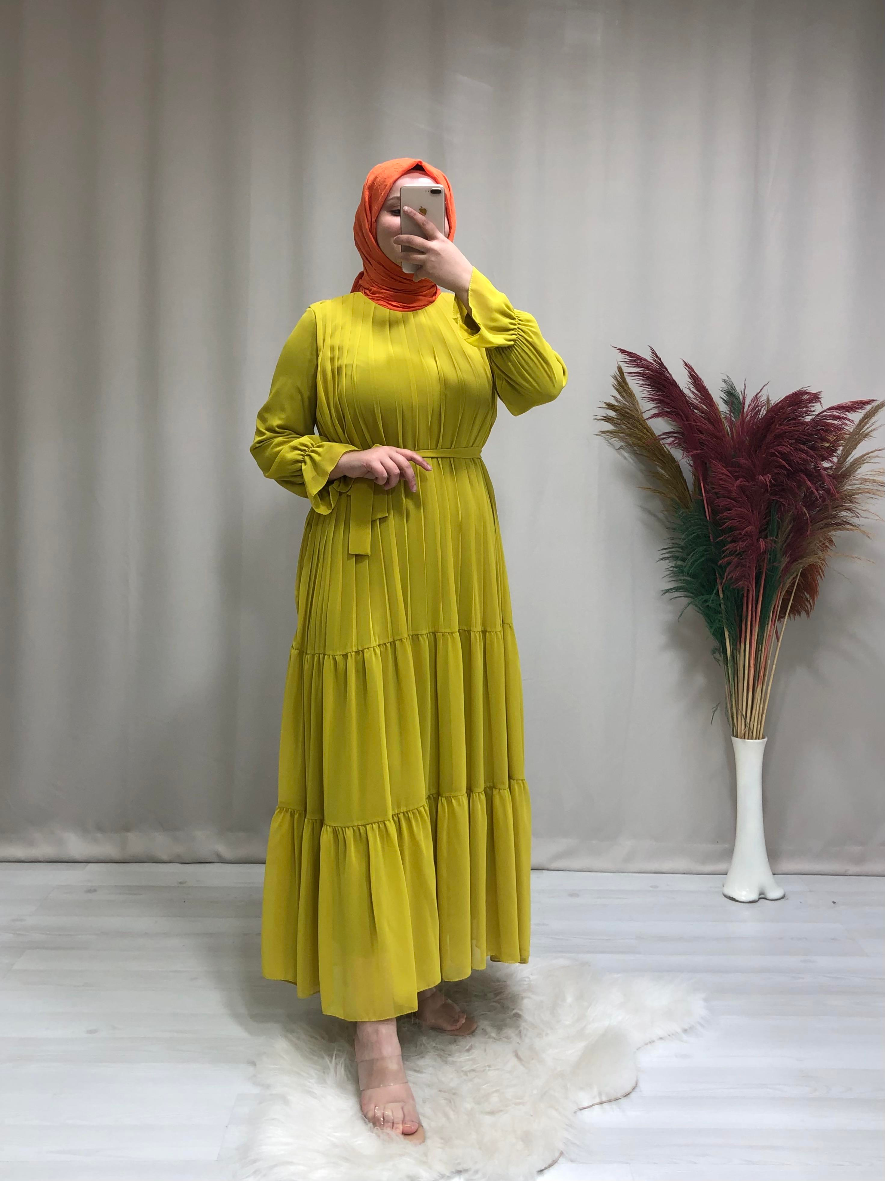 Kadın yazlık şifon  fırfırlı  detaylı tesettür  elbise.  Ürünümüz bisiklet yaka, kolları ve etek ucları fırfır detaylı, belden kuşaklı,