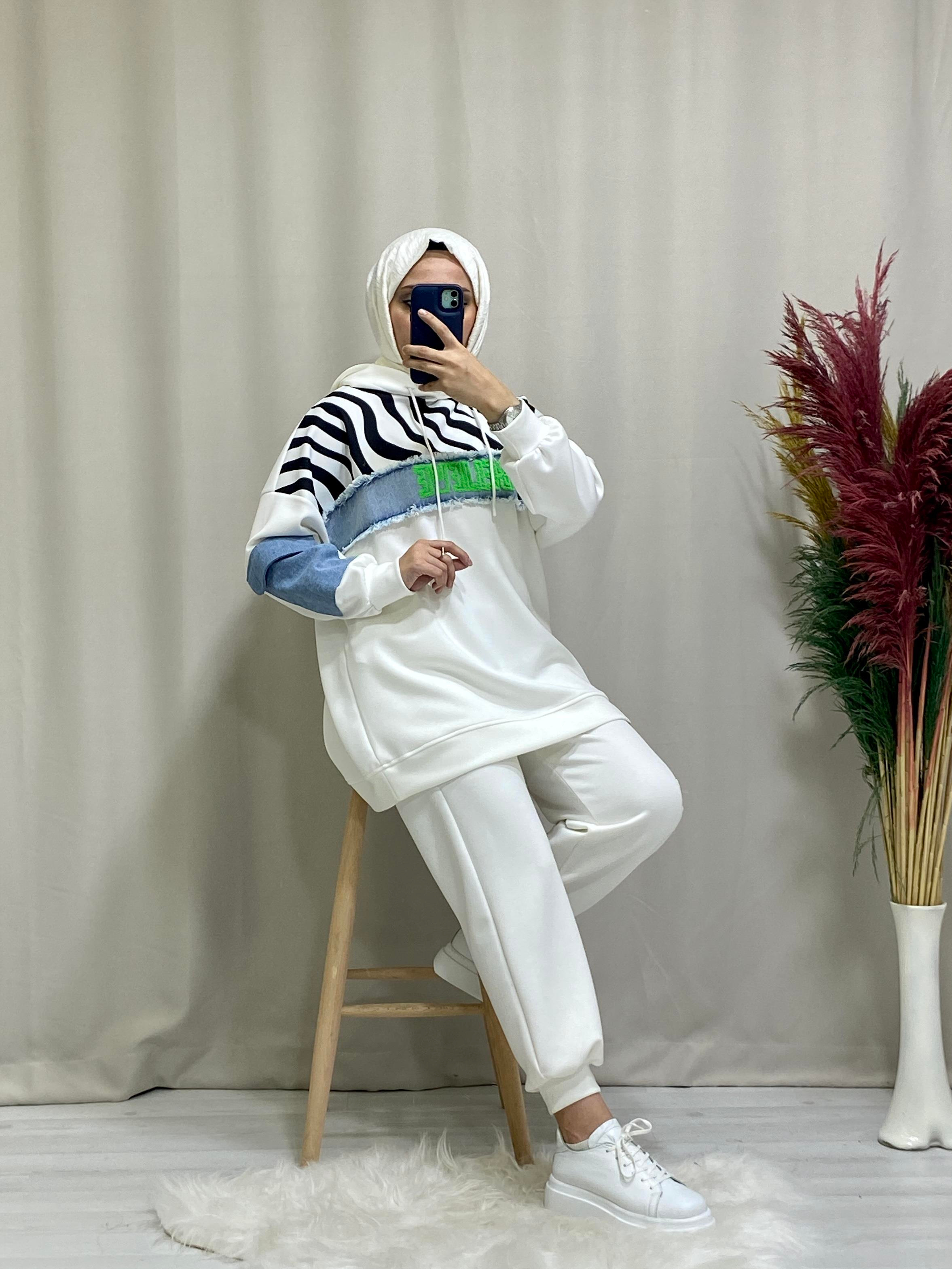 Ürünümüz önden zebra ve kot yazı detaylı, kapüşonlu, düşük omuz ve eşofman altı bol paçadır. Geniş kesimdir rahatlıkla tercih edebilirsiniz. Ürün üst boy: 78 cm Alt boy: 100 cm