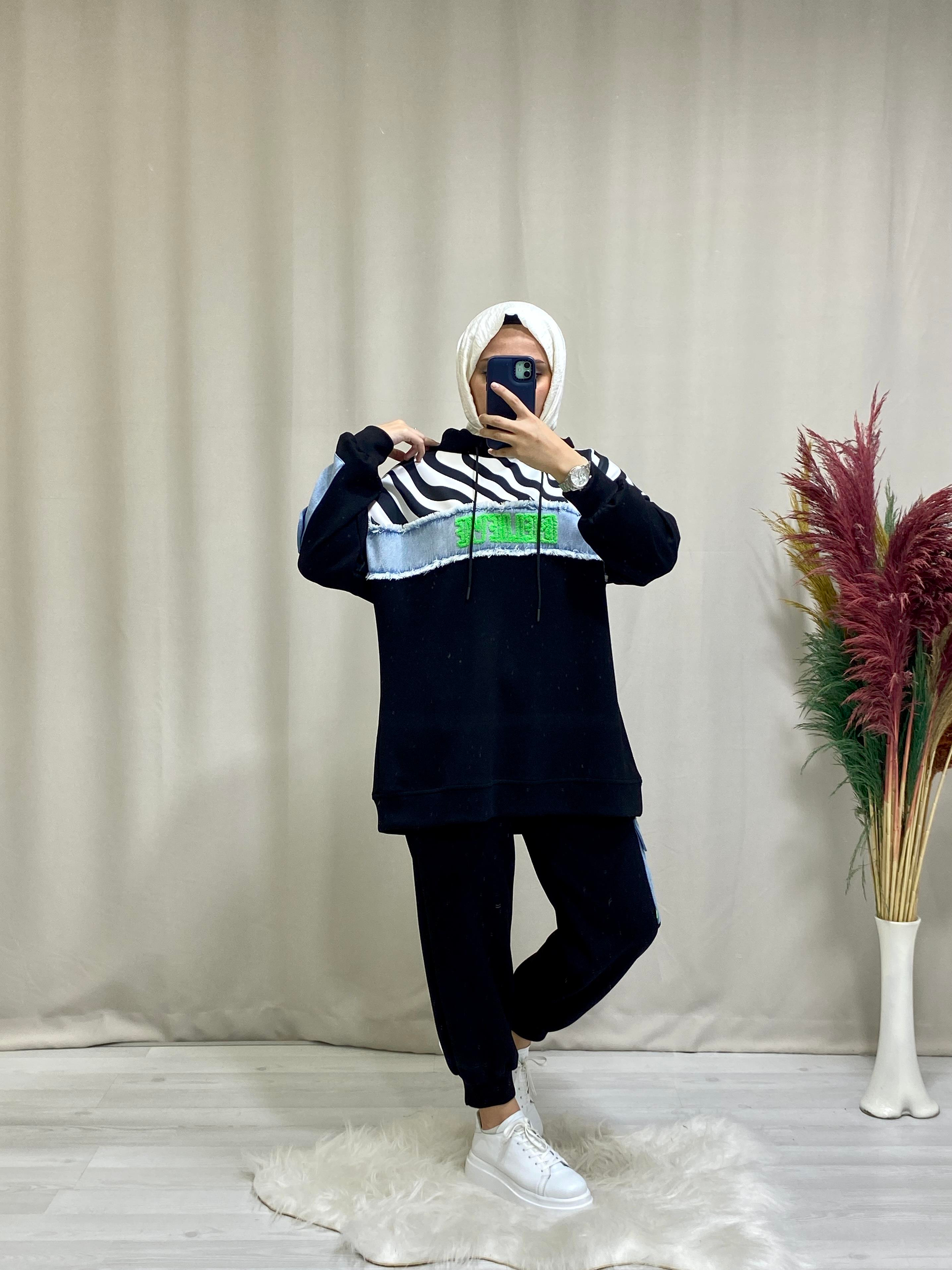 Ürünümüz önden zebra ve kot yazı detaylı, kapüşonlu, düşük omuz ve eşofman altı bol paçadır. Geniş kesimdir rahatlıkla tercih edebilirsiniz. Ürün üst boy: 78 cm Alt boy: 100 cm
